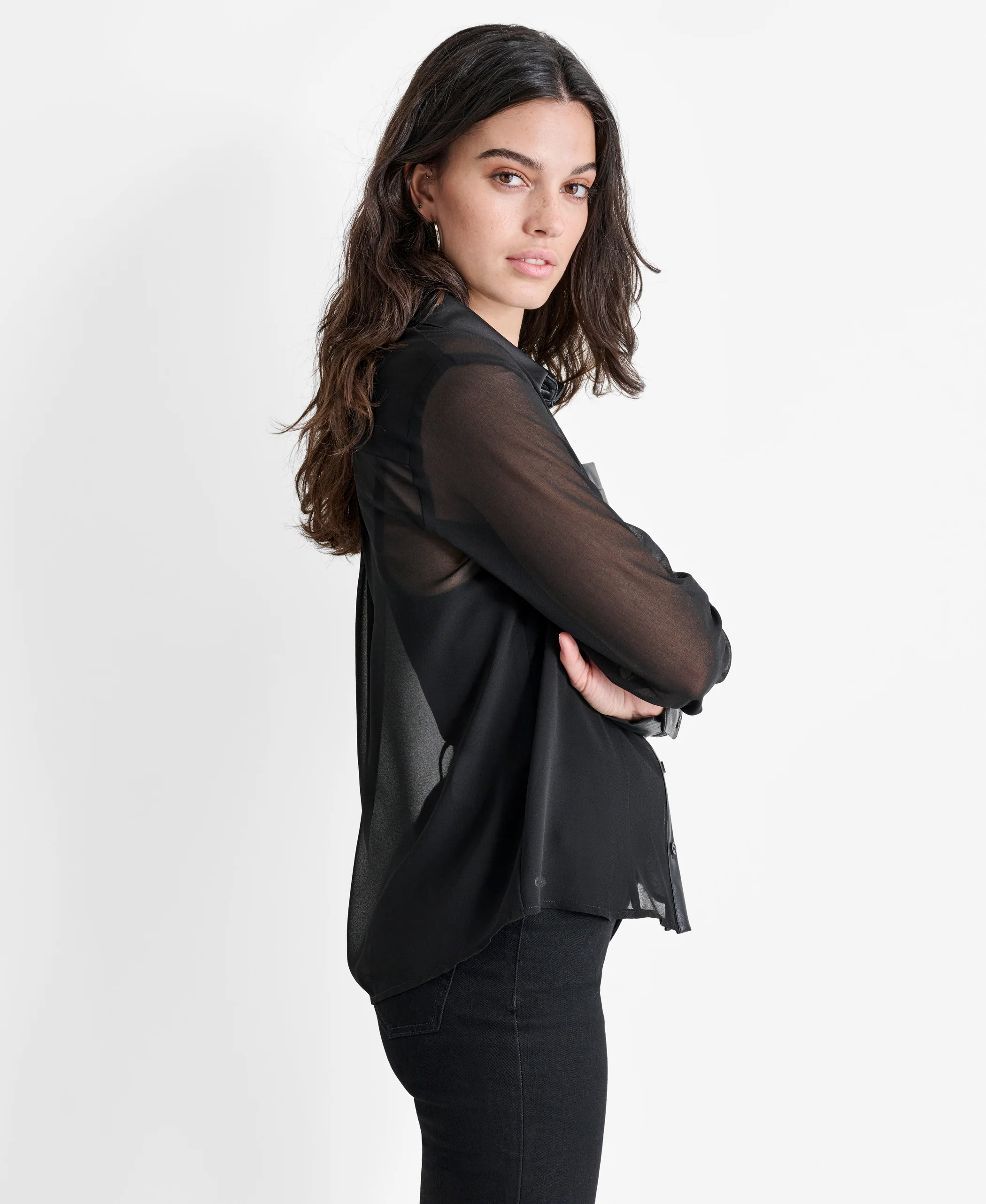 Эта полупрозрачная рубашка обеспечит непринужденный и стильный образ как днем, так и вечером.