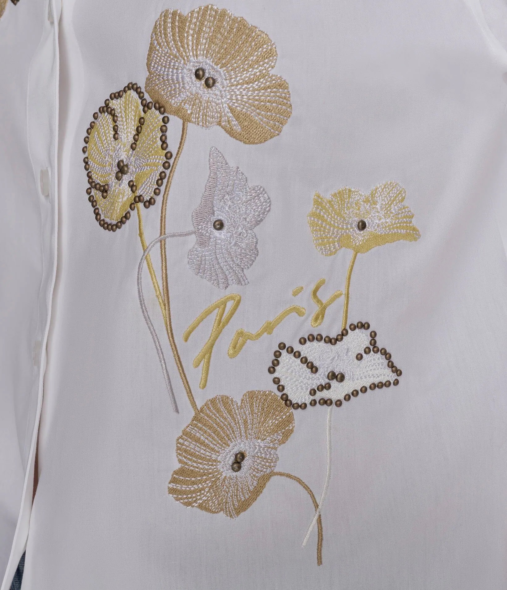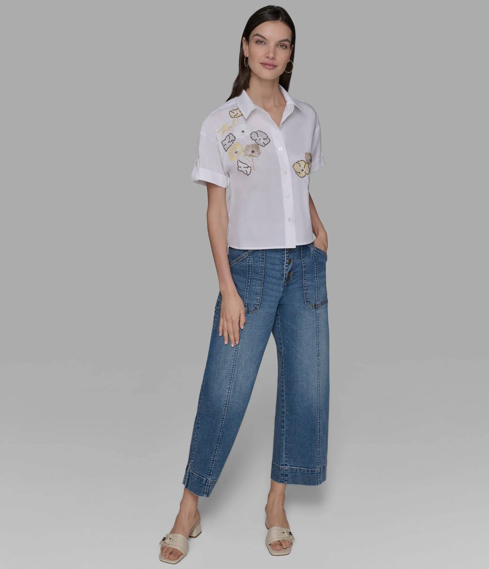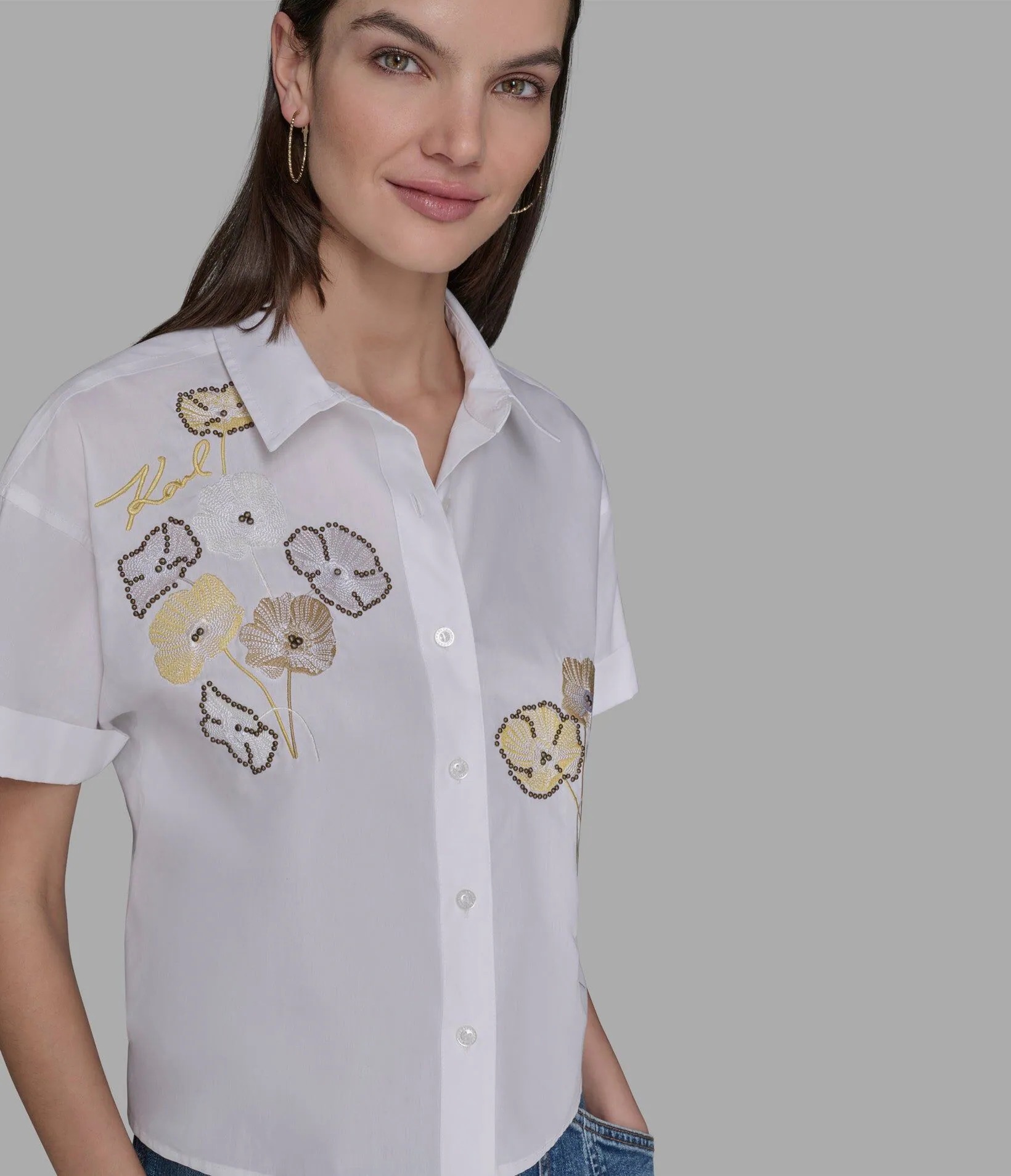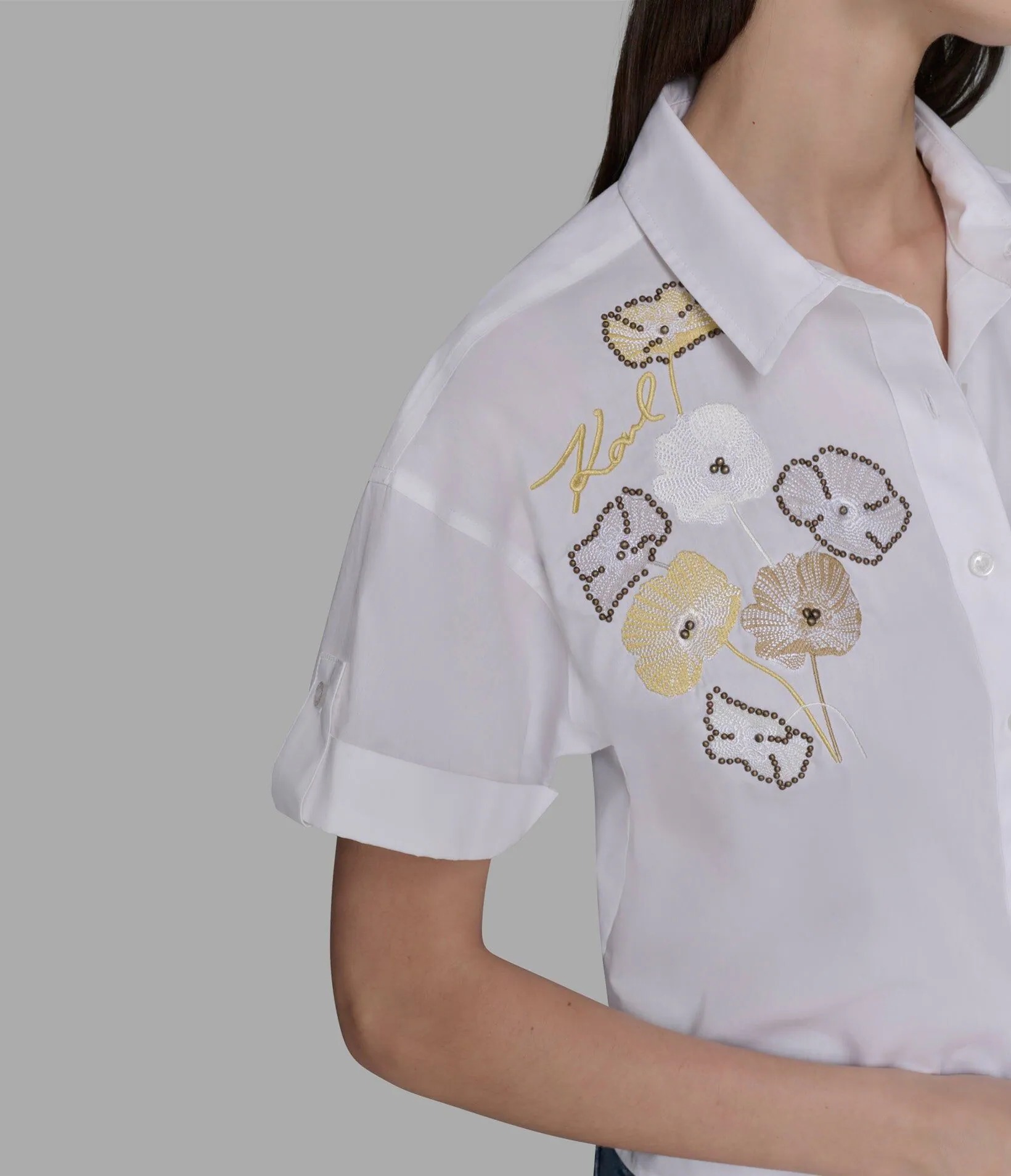 Укороченная блуза рубашечного кроя, спереди украшена цветочной вышивкой с логотипом бренда.
