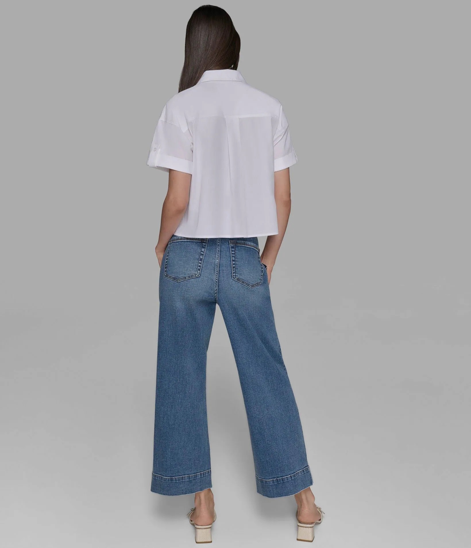 Короткие рукава с подворотами на пуговицах, рубашечный отложной воротник.