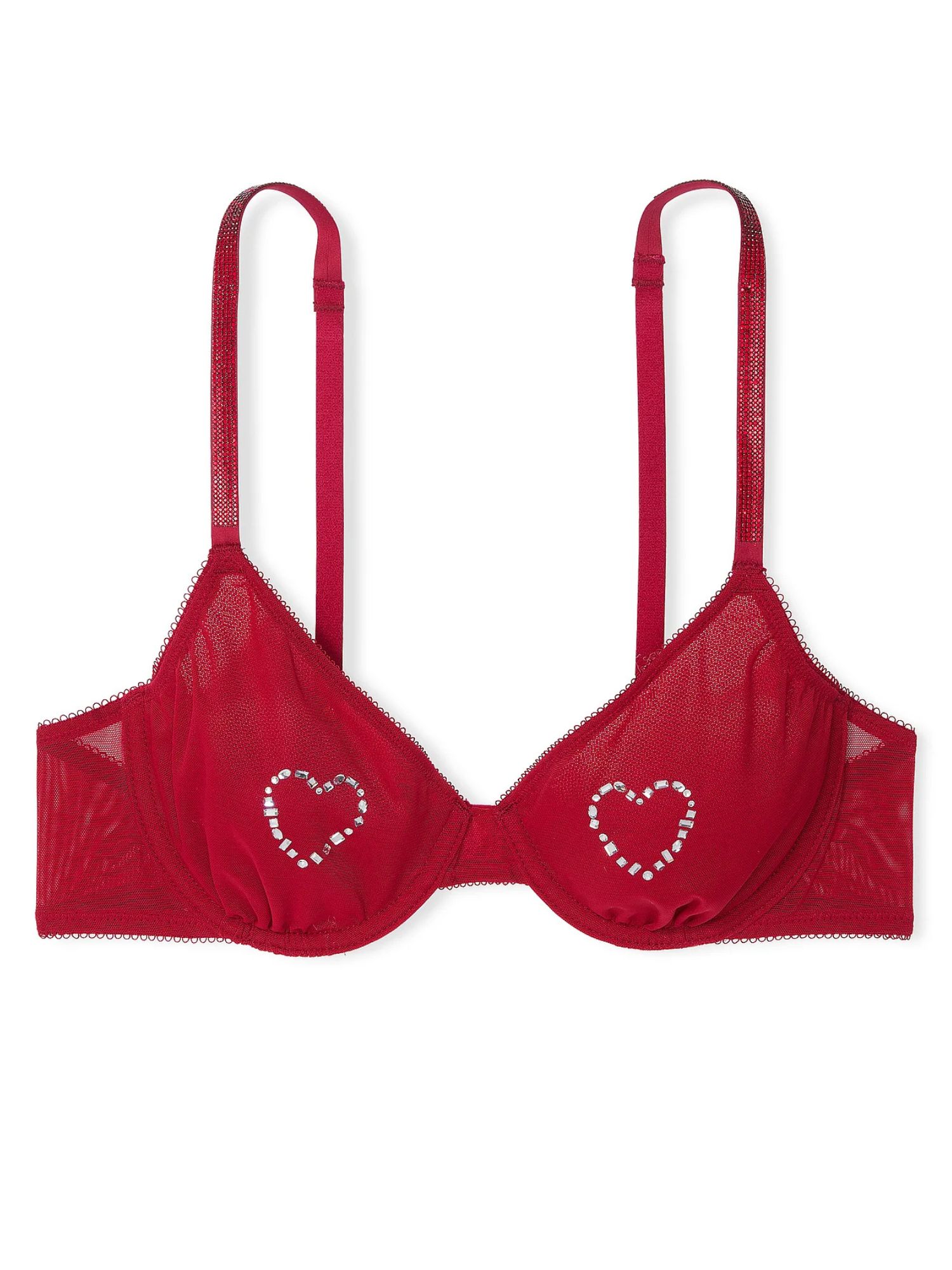 На груди бюст украшен сердцами из страз, на бретелях стразами.
