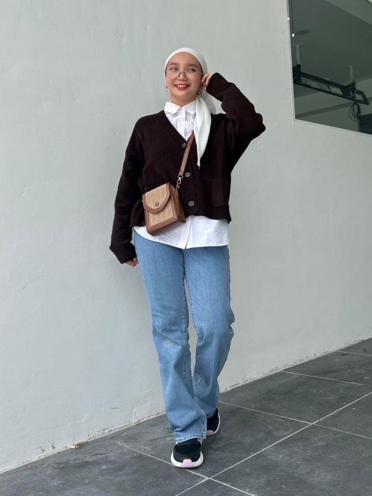 Джинсы зауженного кроя от талии до бедер и ягодиц, расклешенные выше колена для визуального удлинения ног.