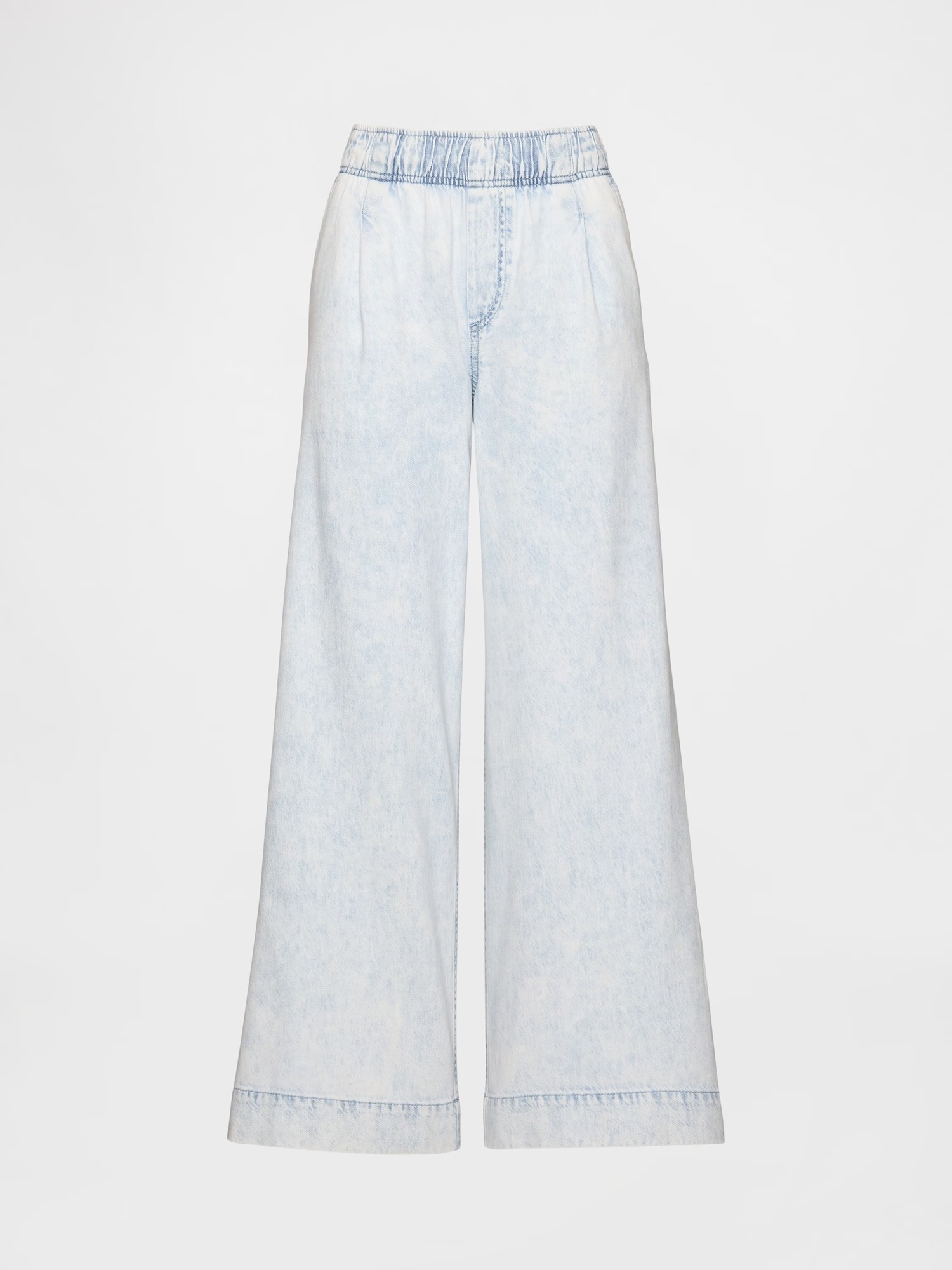 Модель выполнена из мягкого денима, который обеспечивает удобство в течение всего дня. Эластичный пояс на резинке дополнен скрытыми завязками для индивидуальной регулировки посадки. Спереди предусмотрены аккуратные складки, придающие дополнительный объем и комфорт. Конструкция без пуговиц и молнии делает модель максимально практичной.
