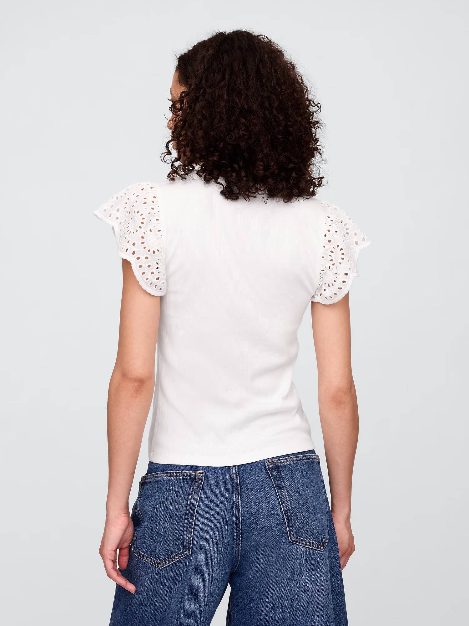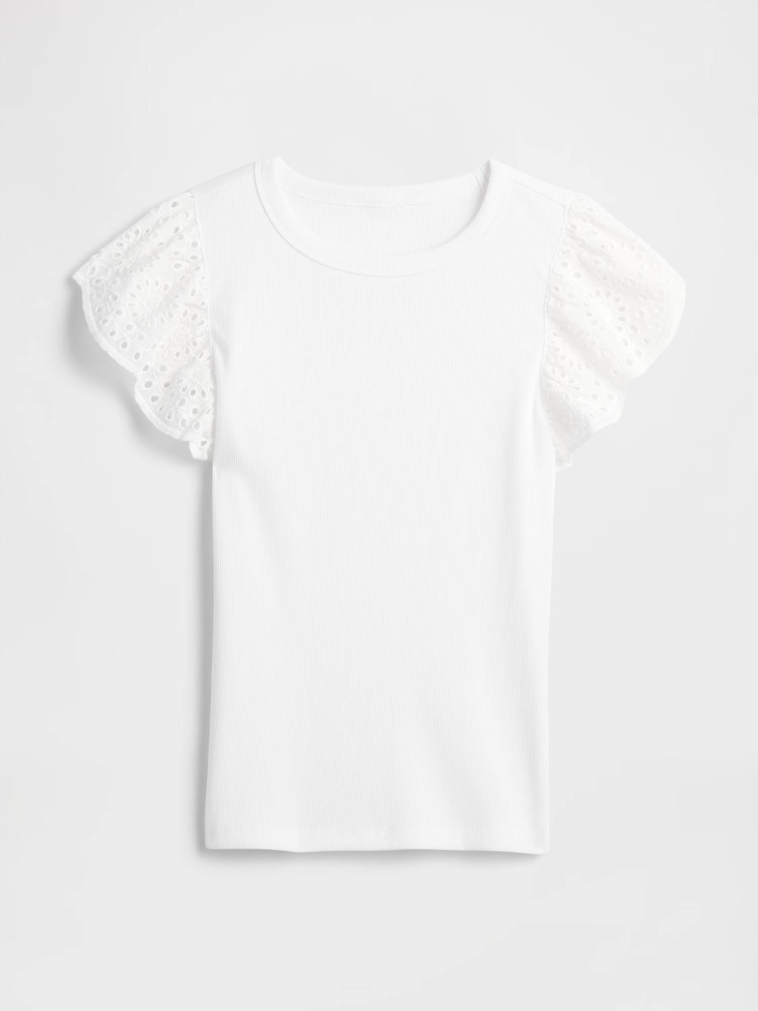 Круглый вырез горловины, короткие рукава-крылышки с перфорацией и вышивкой.