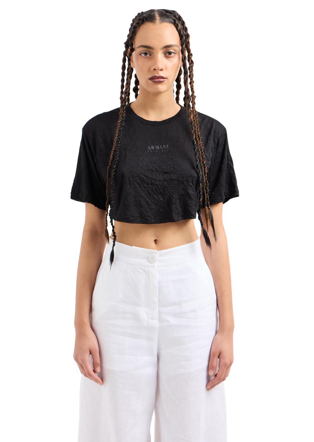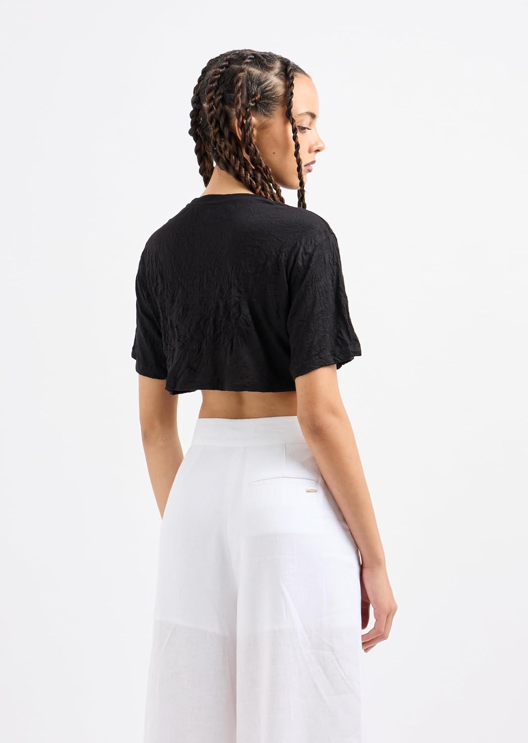 Стильная укороченная футболка свободного кроя, которая станет модным акцентом в повседневном гардеробе. Модель выполнена из мягкой ткани с мятой текстурой, что придает изделию современный и немного расслабленный вид.