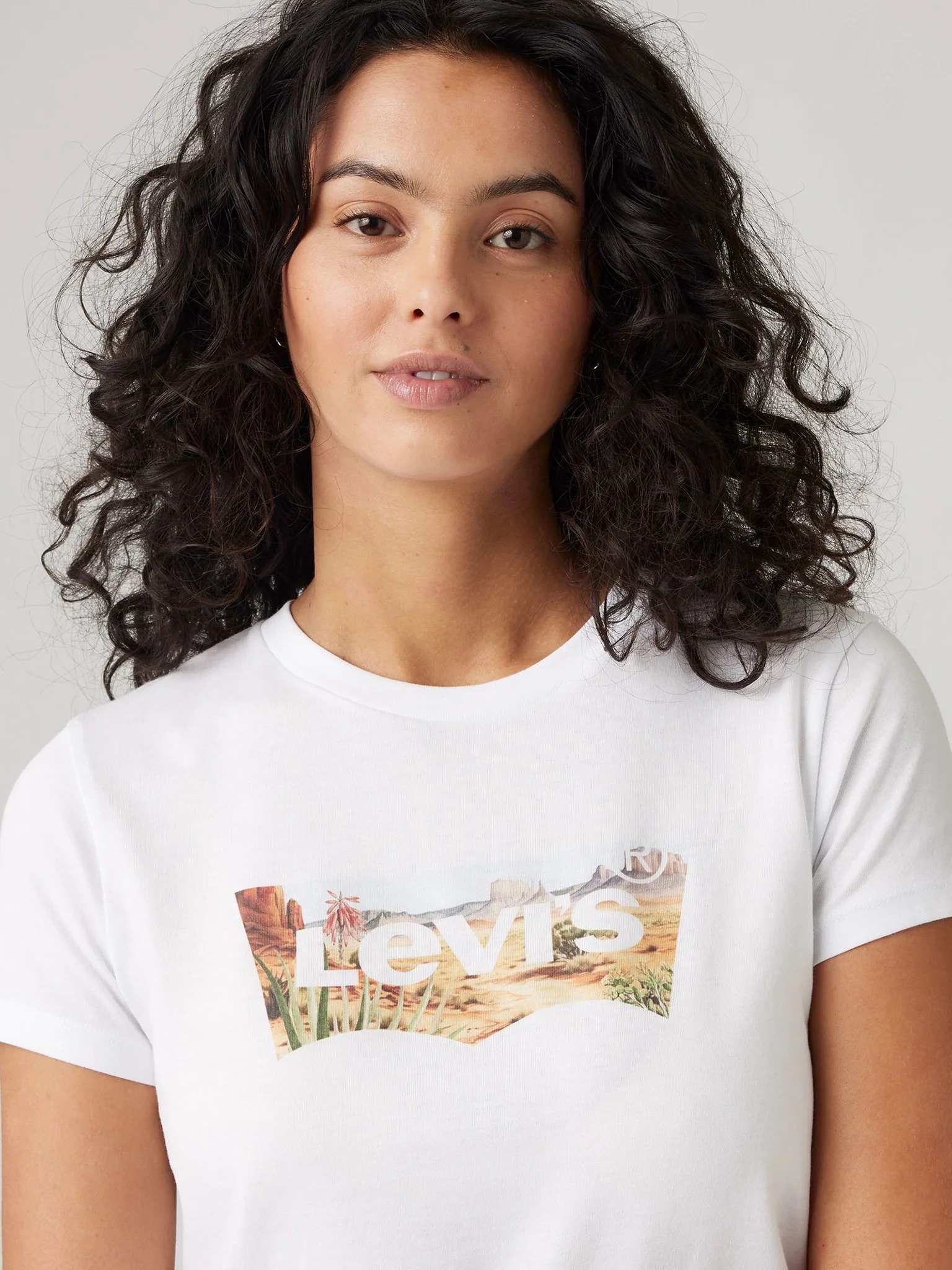 Спереди принт в виде обновленной интерпретации классического логотипа бренда на фоне пустынного пейзажа.