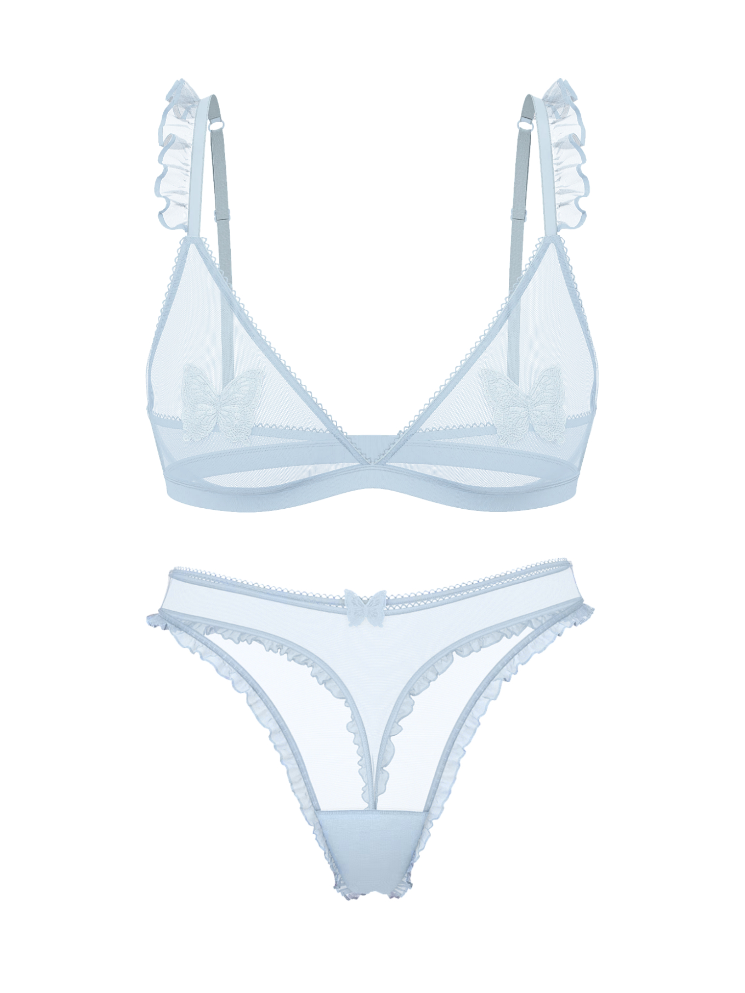 Украшен оборками на бретелях спереди и вышитыми бабочками из органзы на чашечках.
