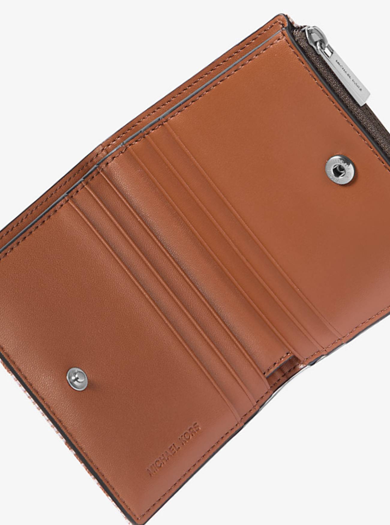 Компактный кошелек из жаккардовой ткани снаружи, украшен монограммой повсей поверхности.