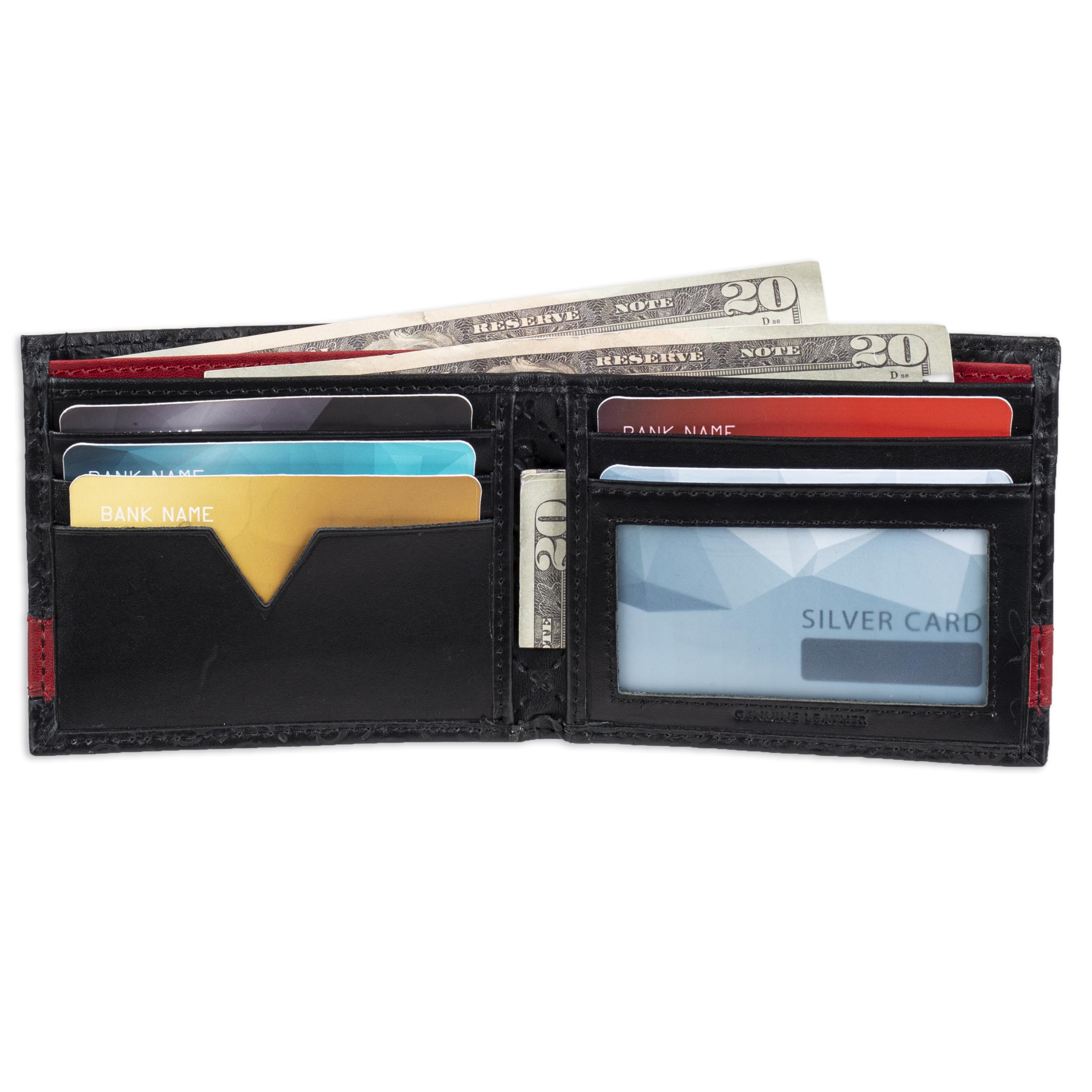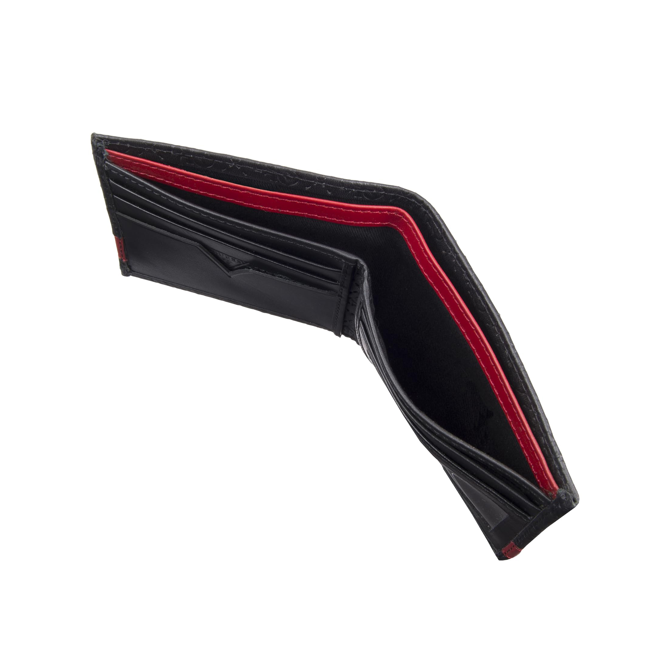 Внутри предусмотрены два отделения для купюр, четыре слота для карт, одно прозрачное отделение, а также два скрытых кармана за слотами для дополнительных мелочей. Лицевая сторона украшена металлическим логотипом Guess.