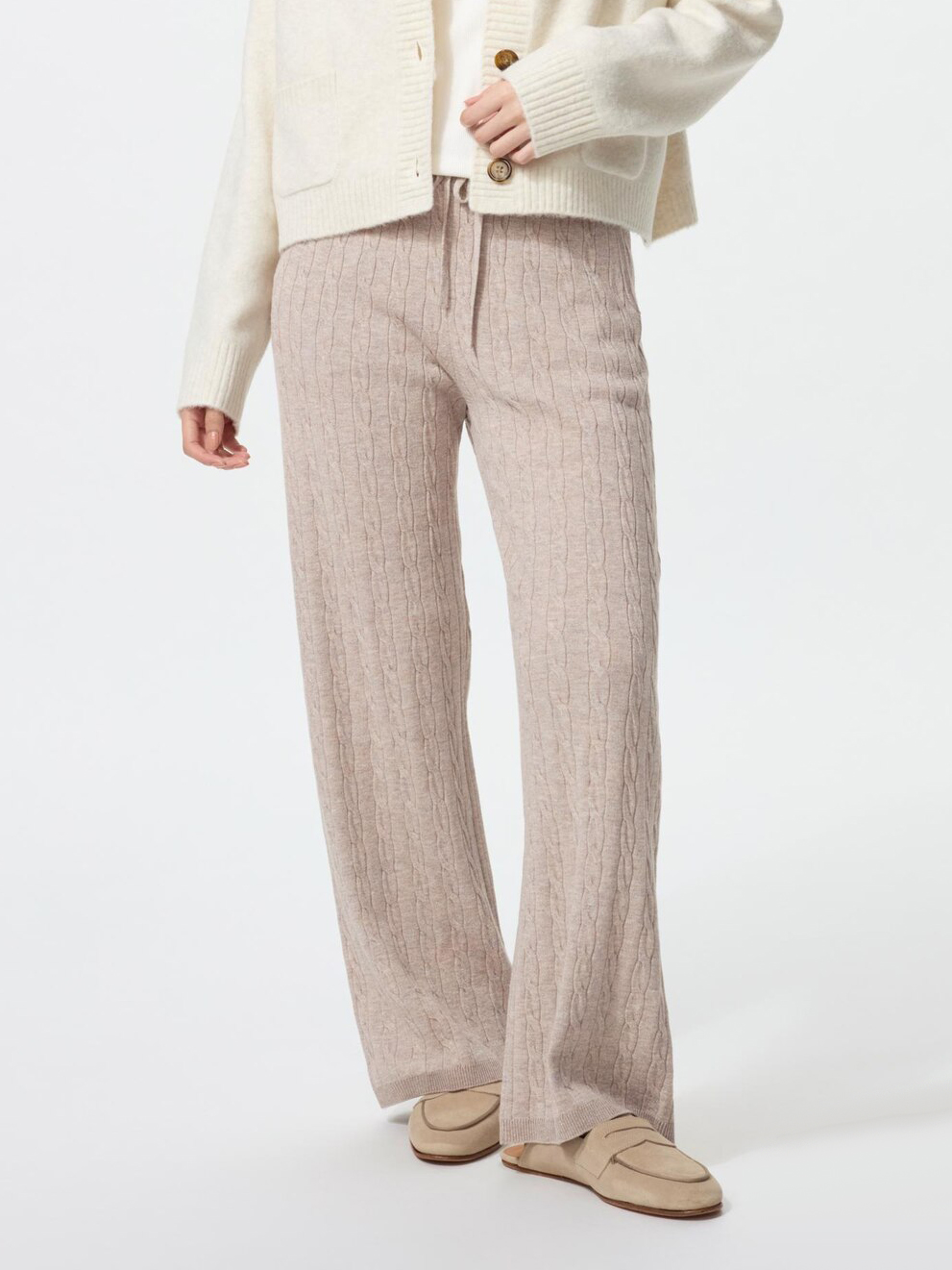 Вязаные штаны выполнены из мягкой вязаной ткани. Эластичный пояс с завязками спереди обеспечивает надежную фиксацию и комфорт в движении. Модель дополнена двумя боковыми карманами.