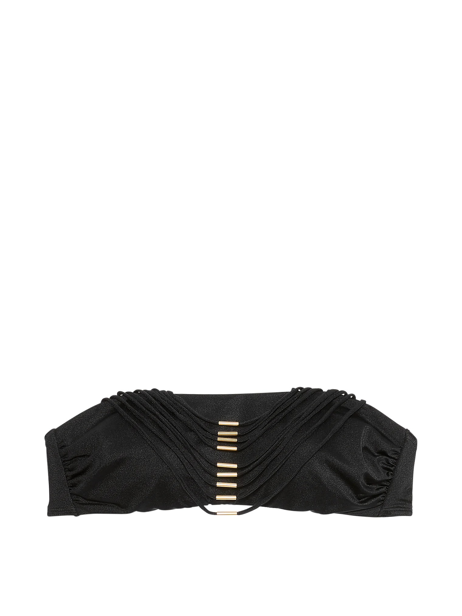 Спереди бандо декорировано ремешками с золотистой фурнитурой.