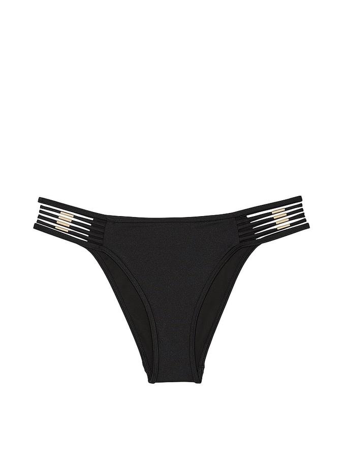 Плавки бразильяны с эластичными бретелями и декорированными ремешками с золотистой фурнитурой по бокам.