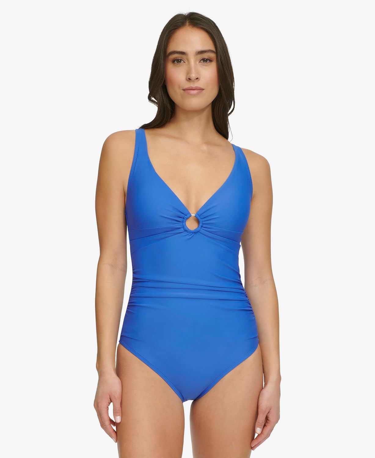 Этот удобный, быстросохнущий купальник спереди украшен декоративным кольцом и складками по бокам.