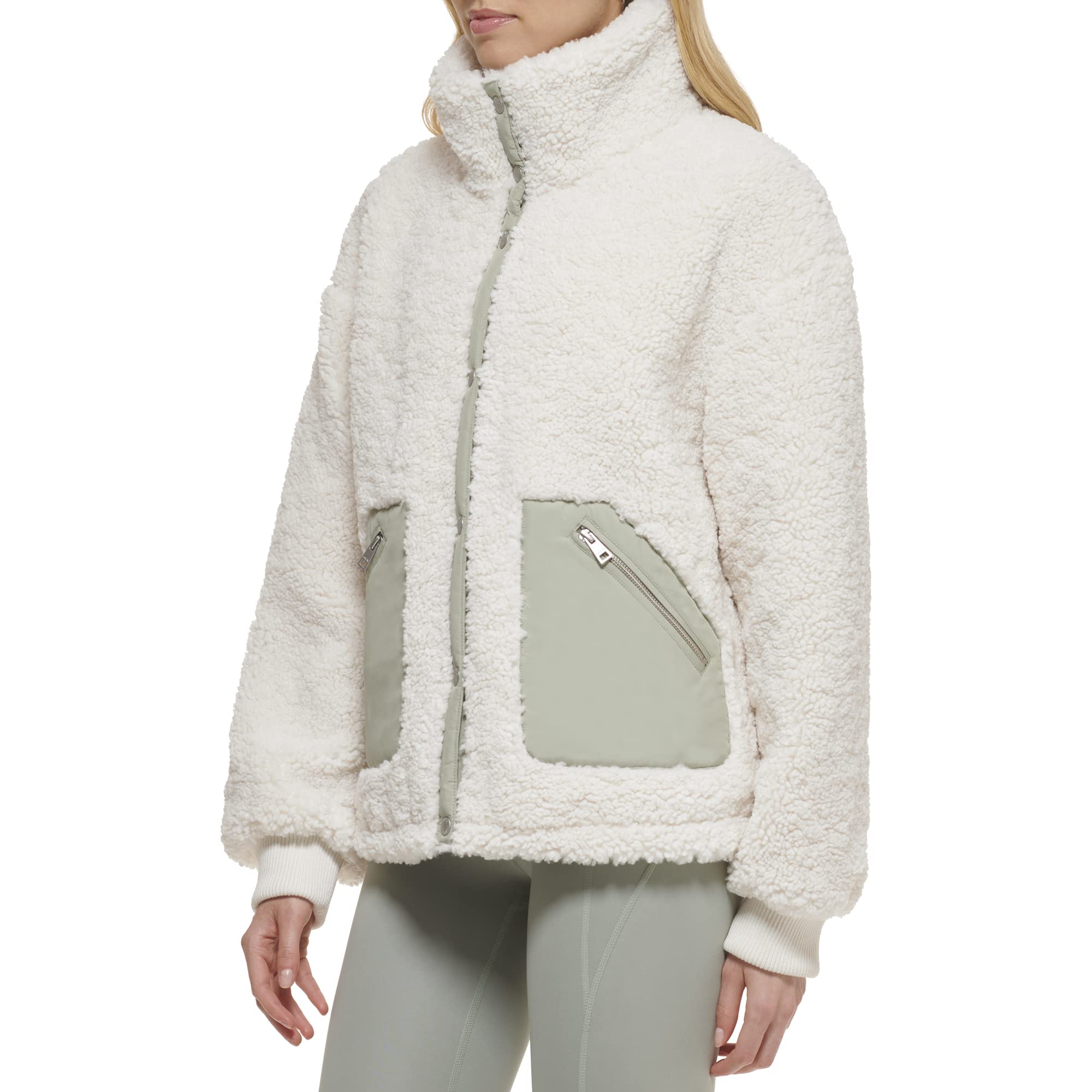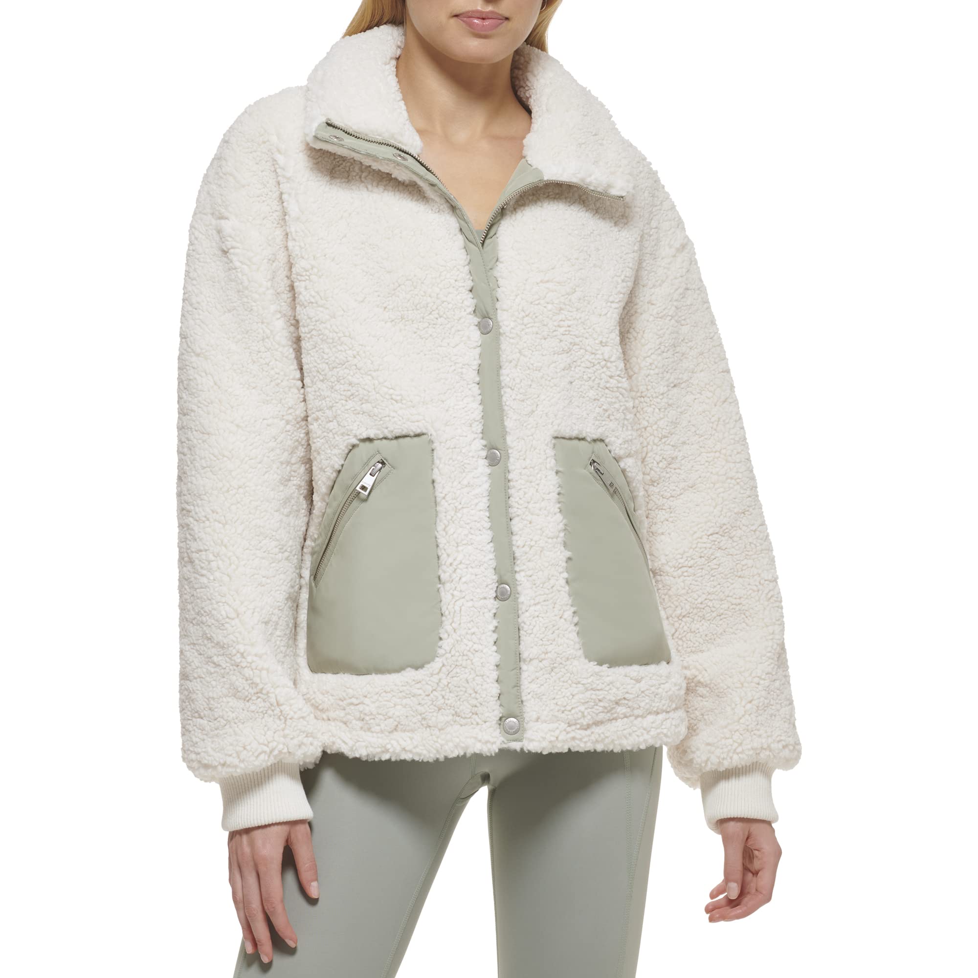 Теплая куртка из шерпы со вставками из текстиля контрастного цвета.