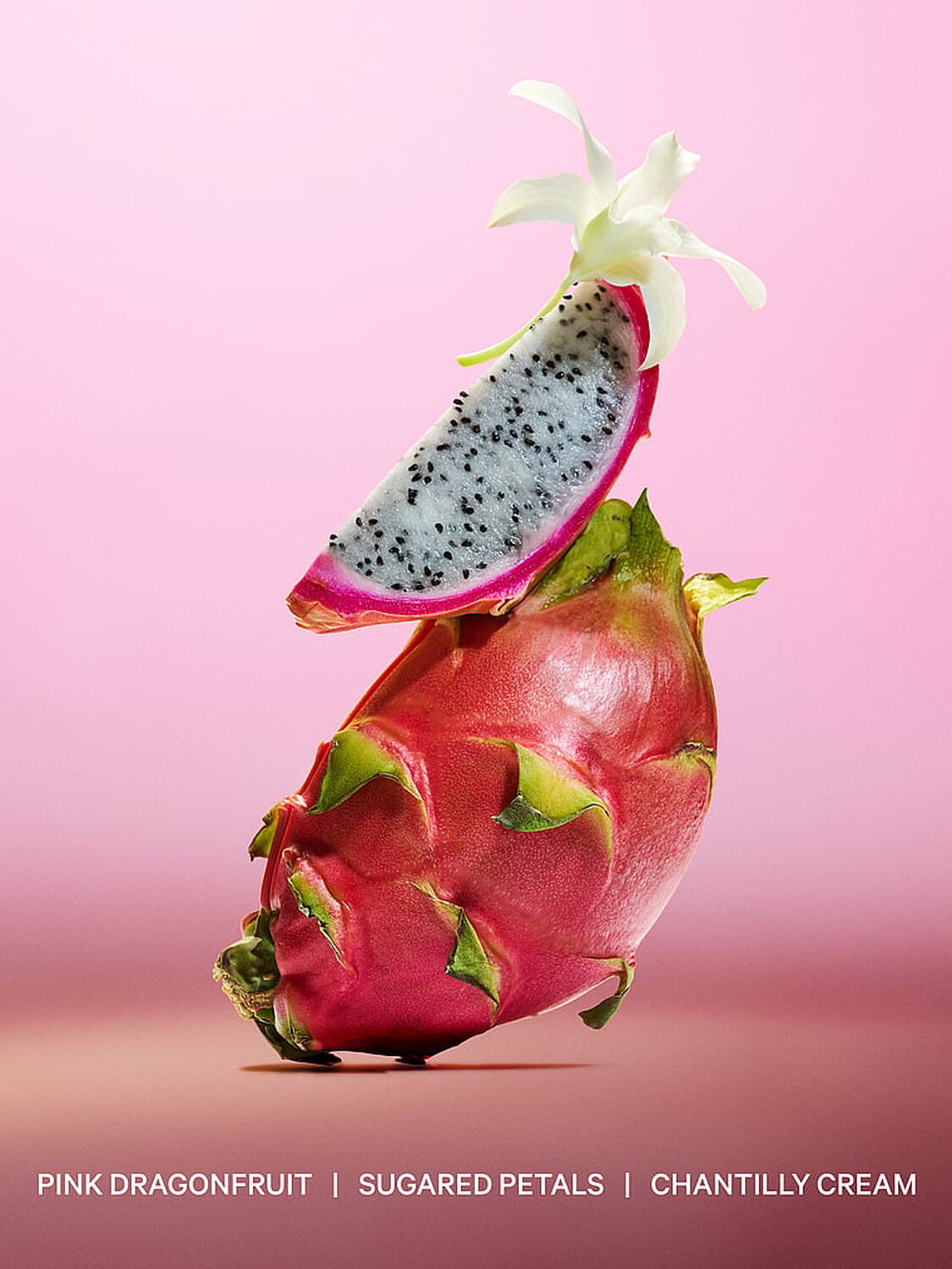 Розовый драконов фрукт, сахарные лепестки, крем шантильи |