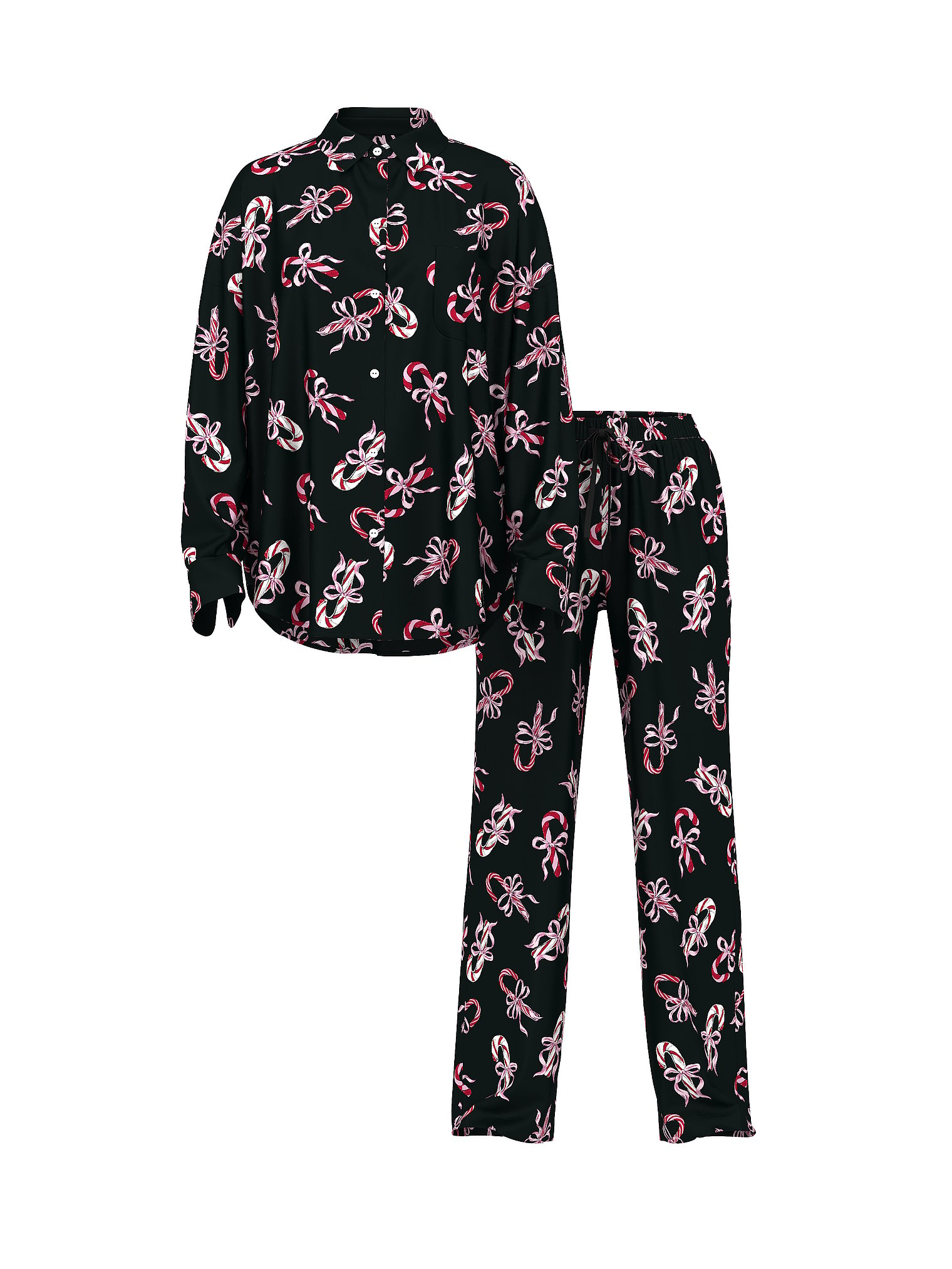 Комплект состоит из двух частей: стильной пижамной оверсайз рубашки с длинным рукавом и удобных пижамных штанов.