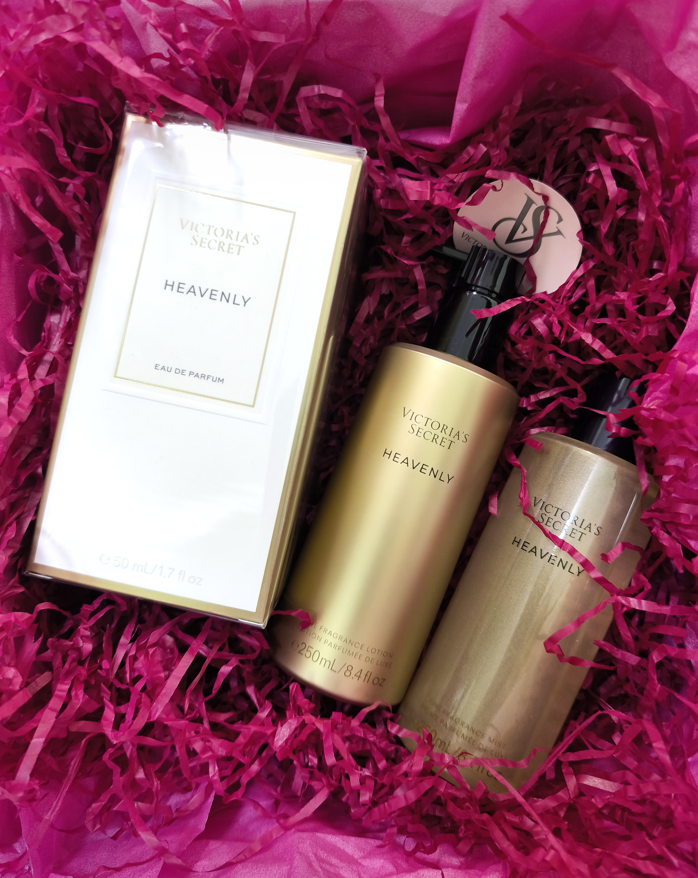 Шикарный набор Heavenly в подарочной коробке включает в себя парфюм, мист и лосьон для тела