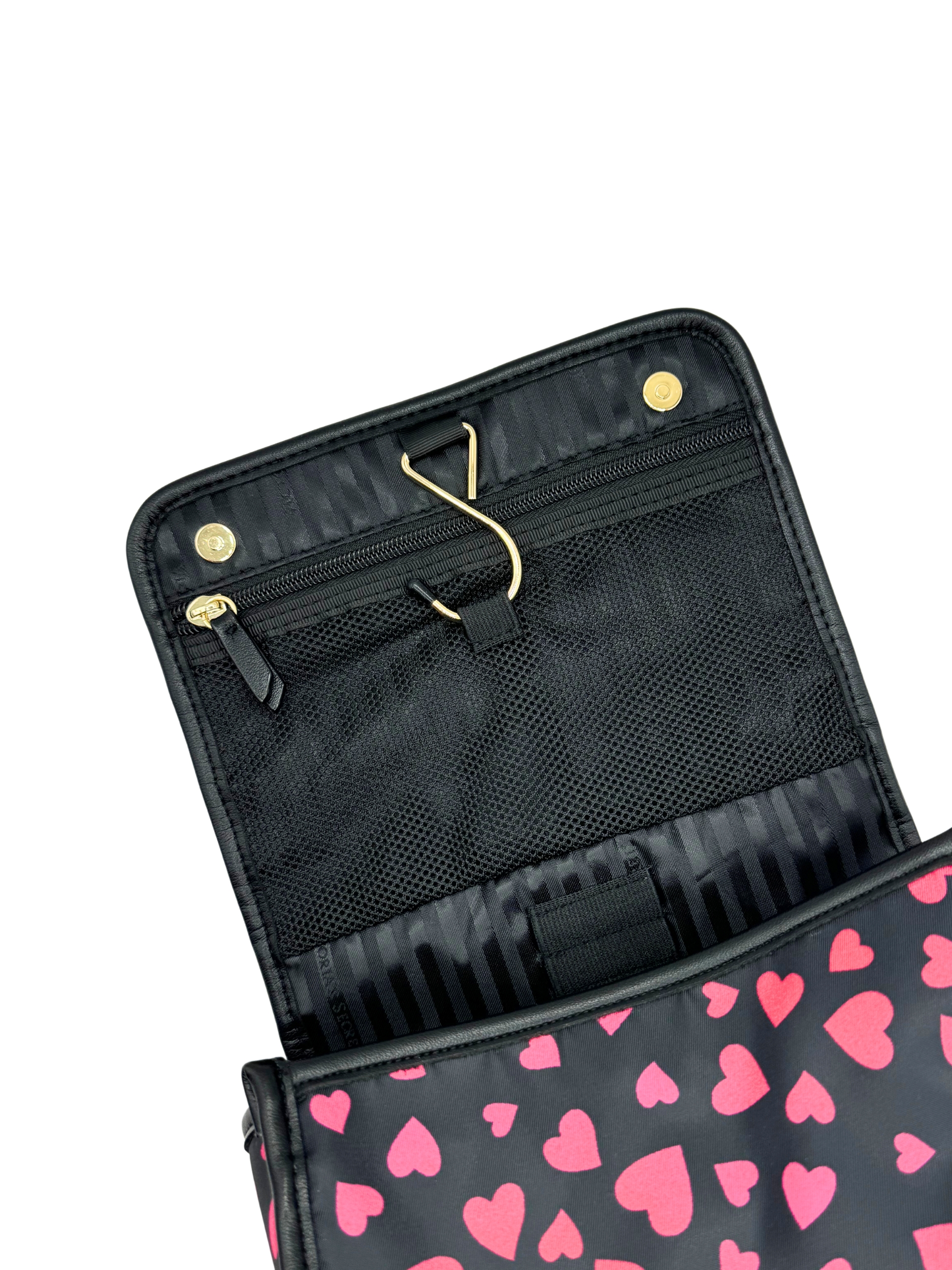 Мягкая косметичка складывается и имеет удобные отделения внутри для хранения. Застегивается на кнопки. Есть верхняя ручка для переноски. Дополнительный крючок позволяет повесить ее, как вам удобно. 1 задний внешний карман на молнии. 1 внутренний карман на молнии. 4 внутренних накладных сетчатых кармана.