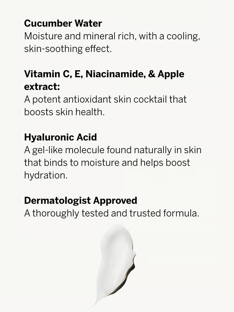 Увлажняющая сыворотка с огуречной водой, гиалуроновой кислотой и антиоксидантным комплексом (витамины С и Е, ниацинамид, экстракт яблока). Помогает поддерживать упругость, гладкость и здоровый вид кожи.
