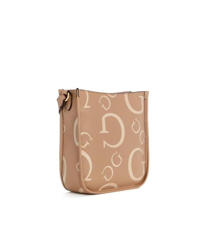 Сумка через плечо выполнена из матового прочного материала с принтом в виде монограммы бренда.