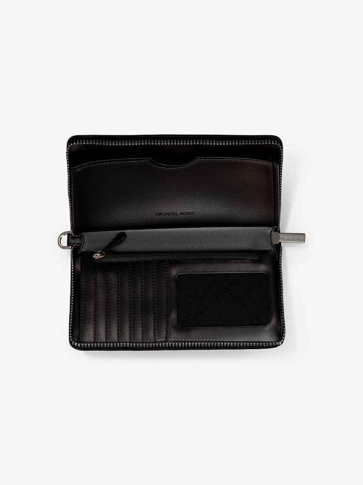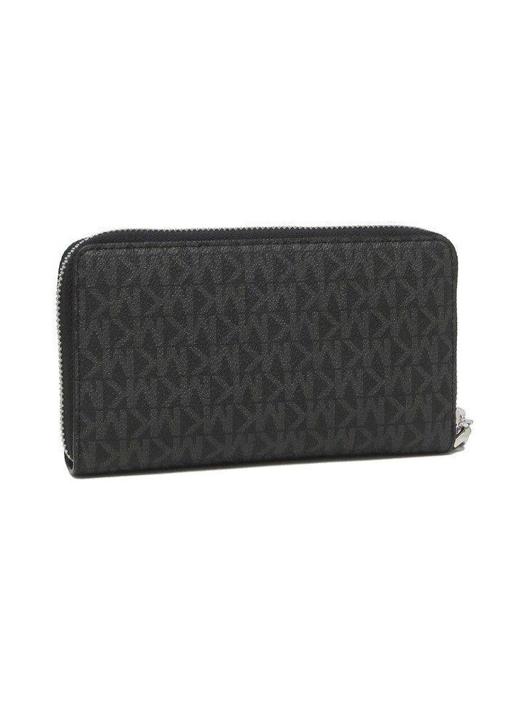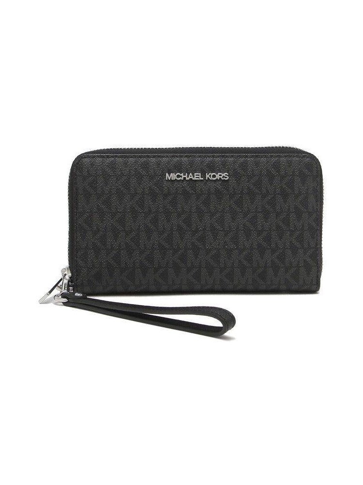 Логотип в виде монограммы по всей поверхности кошелька. Застегивается на молнию. Спереди металлический логотип Michael Kors. Съемный ремешок на запястье делает его достаточно универсальным, чтобы носить отдельно или положить в сумку. Внутренние детали: 2 основных отделения для купюр, 1 отделение на молнии для монет, 7 слотов для карт.