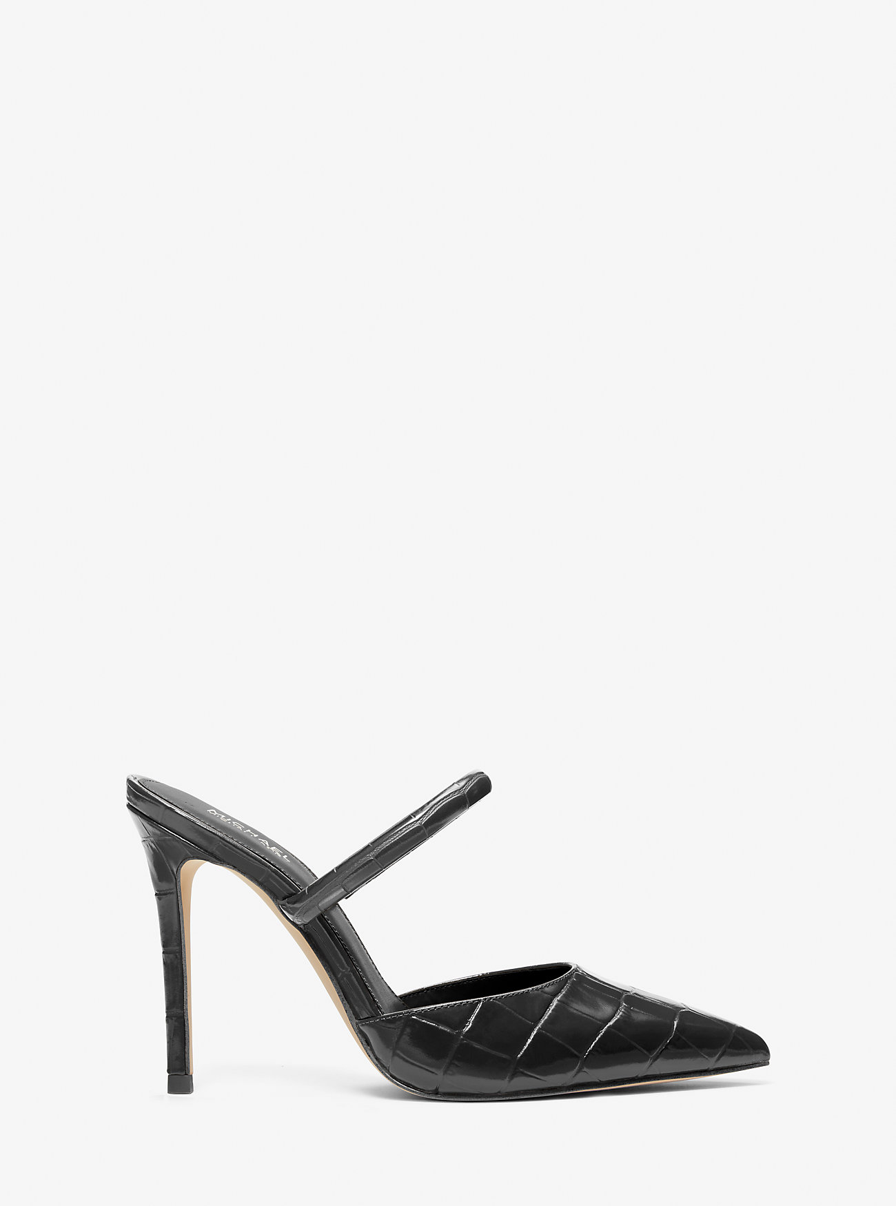 Эти туфли без задника из кожи с тиснением под крокодила имеют заостренный носок и тонкие эластичные ремешки сверху для дополнительной поддержки.