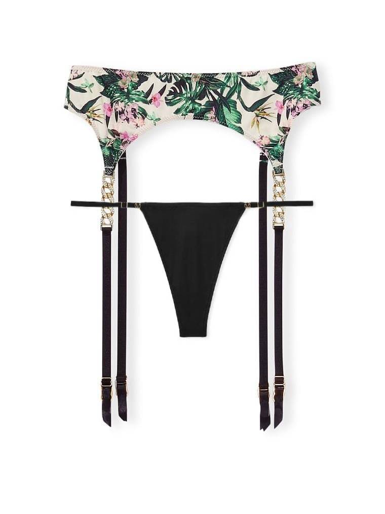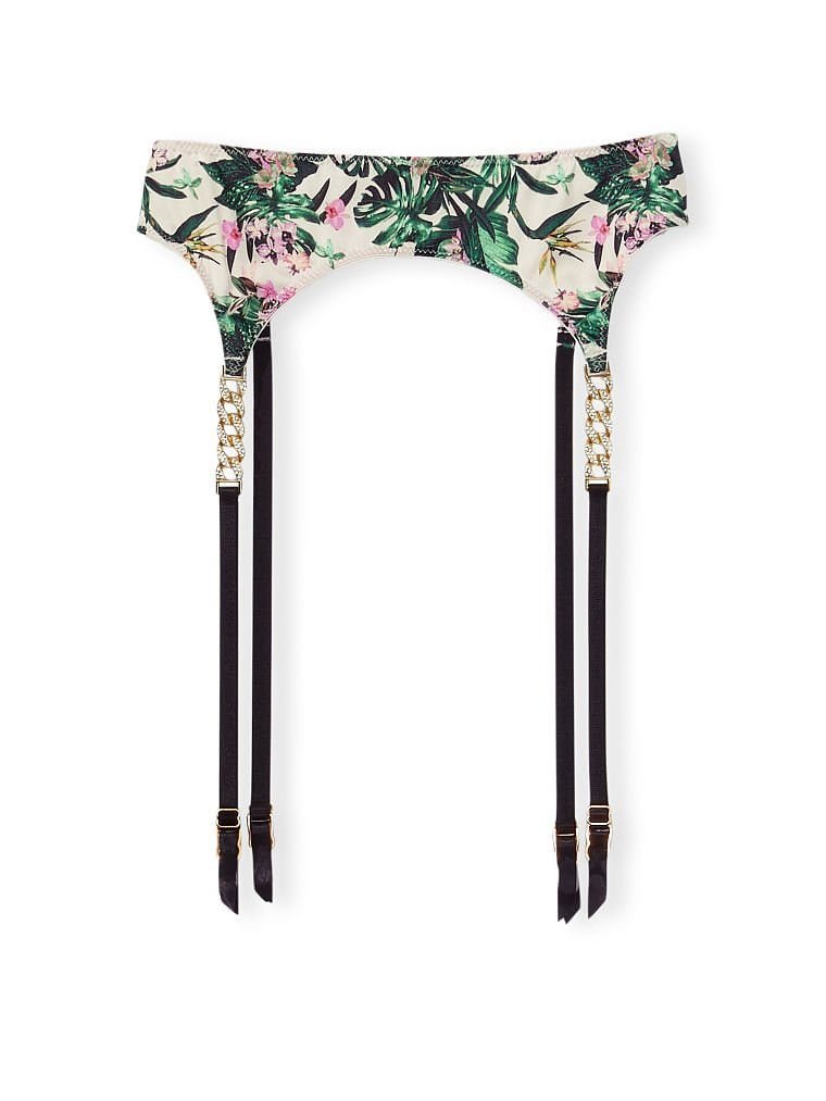 Пояс для панчох з принтом у вигляді тропічних рослин, спереду з гладкої тканини, ззаду - напівпрозорої сіточки.