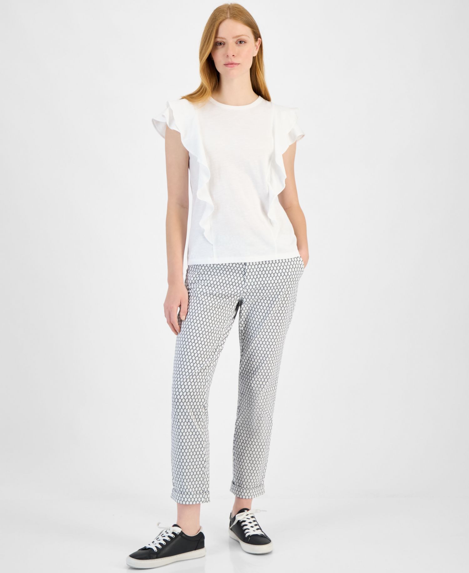 Футболка прикрашена рюшами.