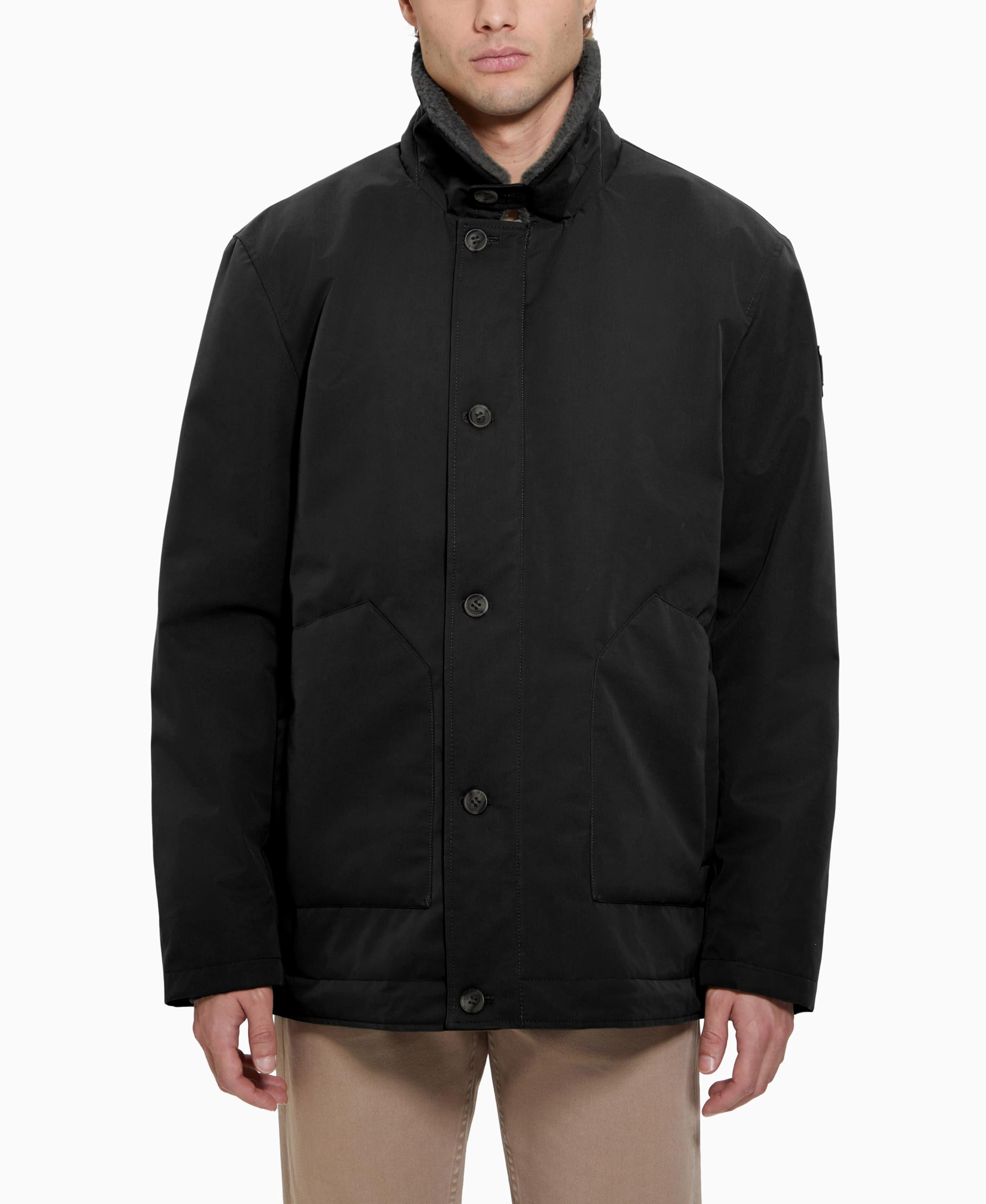 Небольшой воротник-стойка, застёгивающейся на пуговицу.