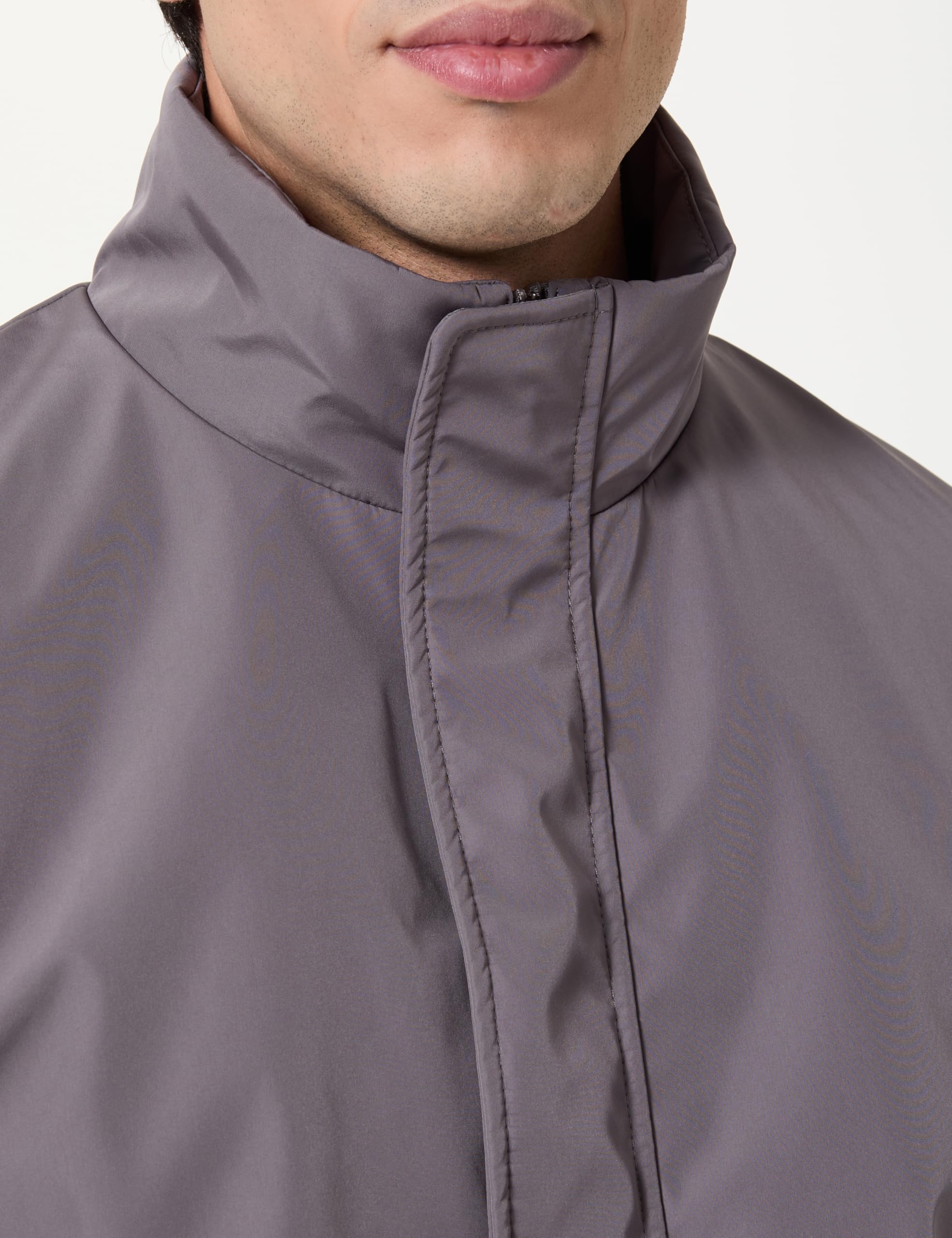 Застібається на блискавку, приховану планкою на кнопках.