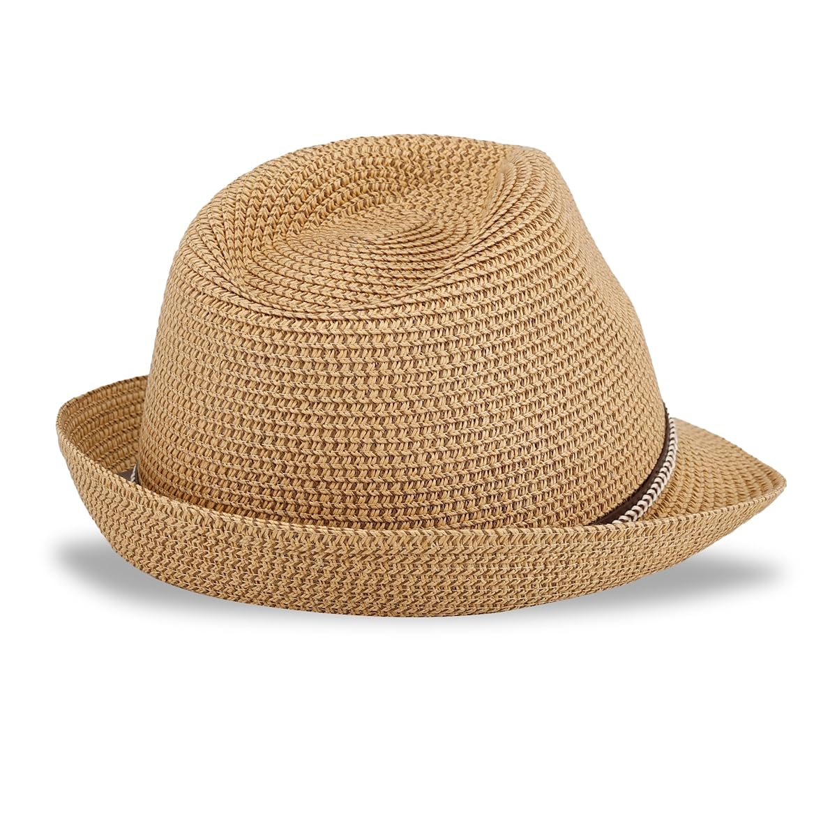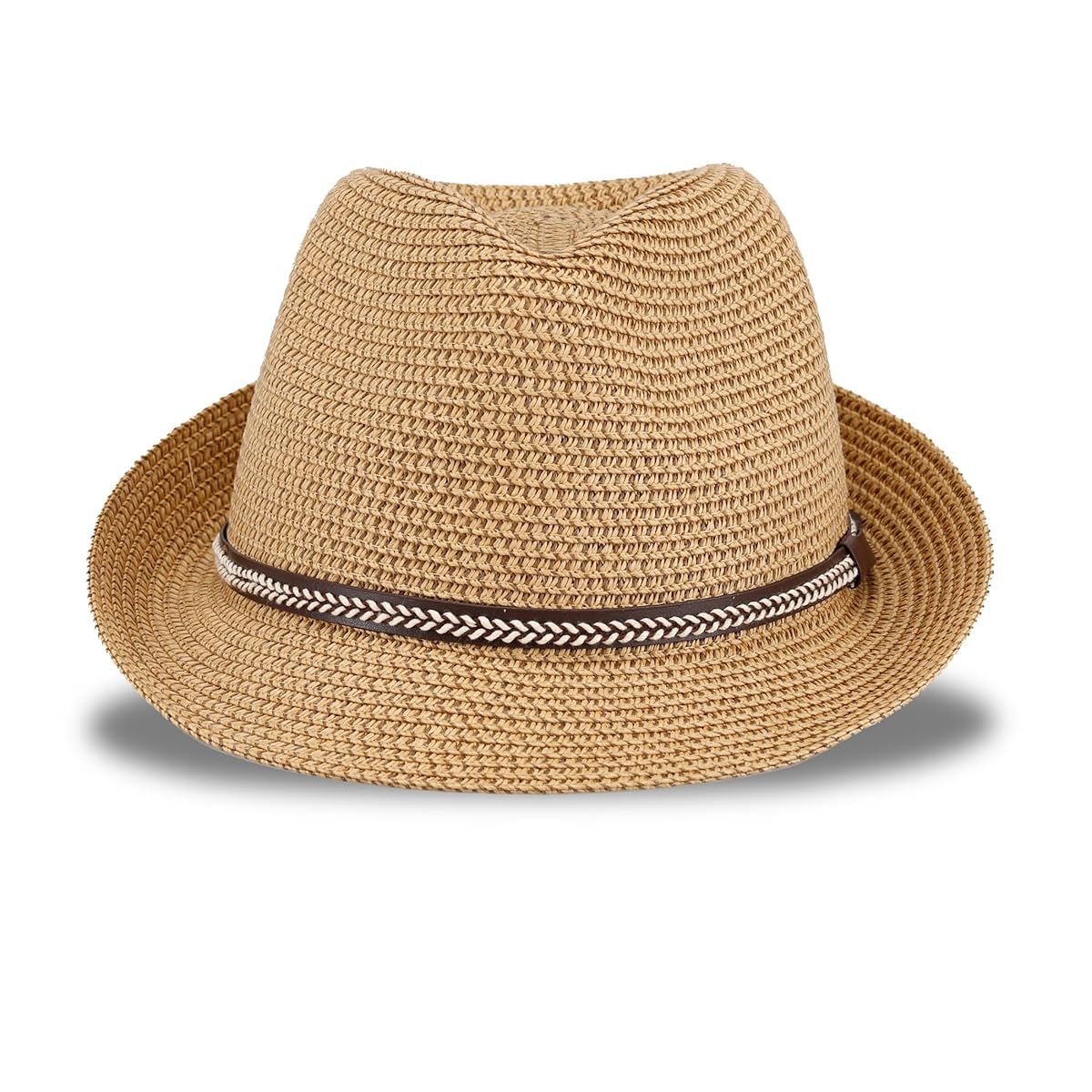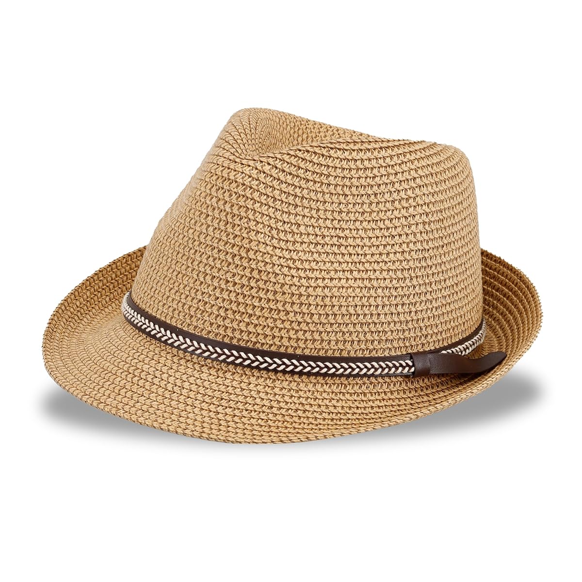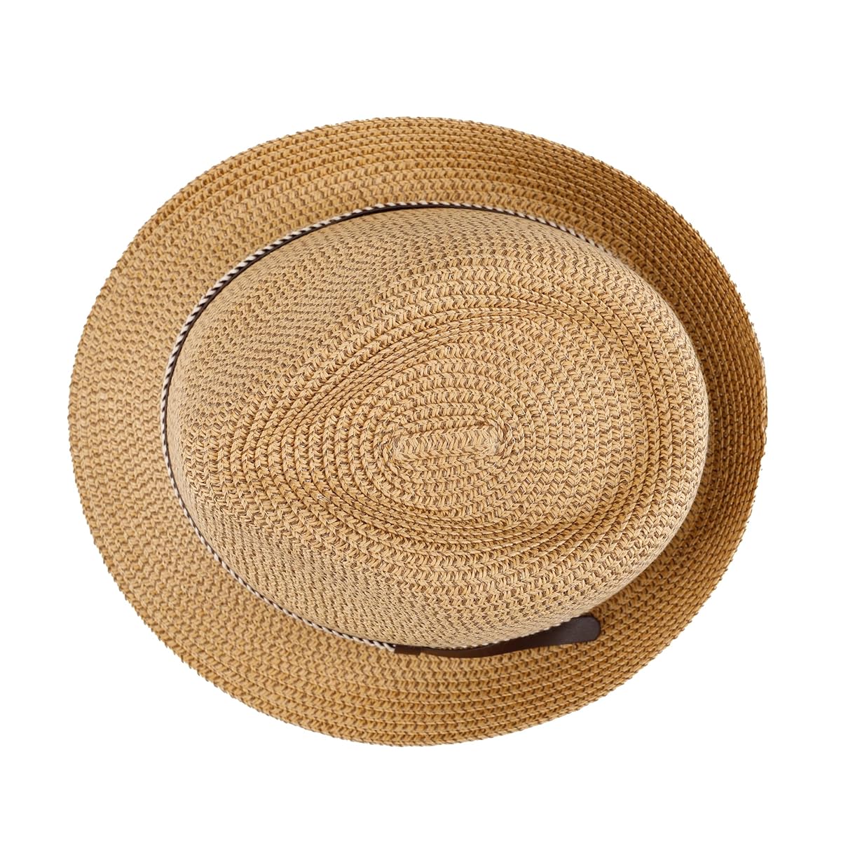 Капелюх декорований контрастною стрічкою з екошкіри з плетінням.