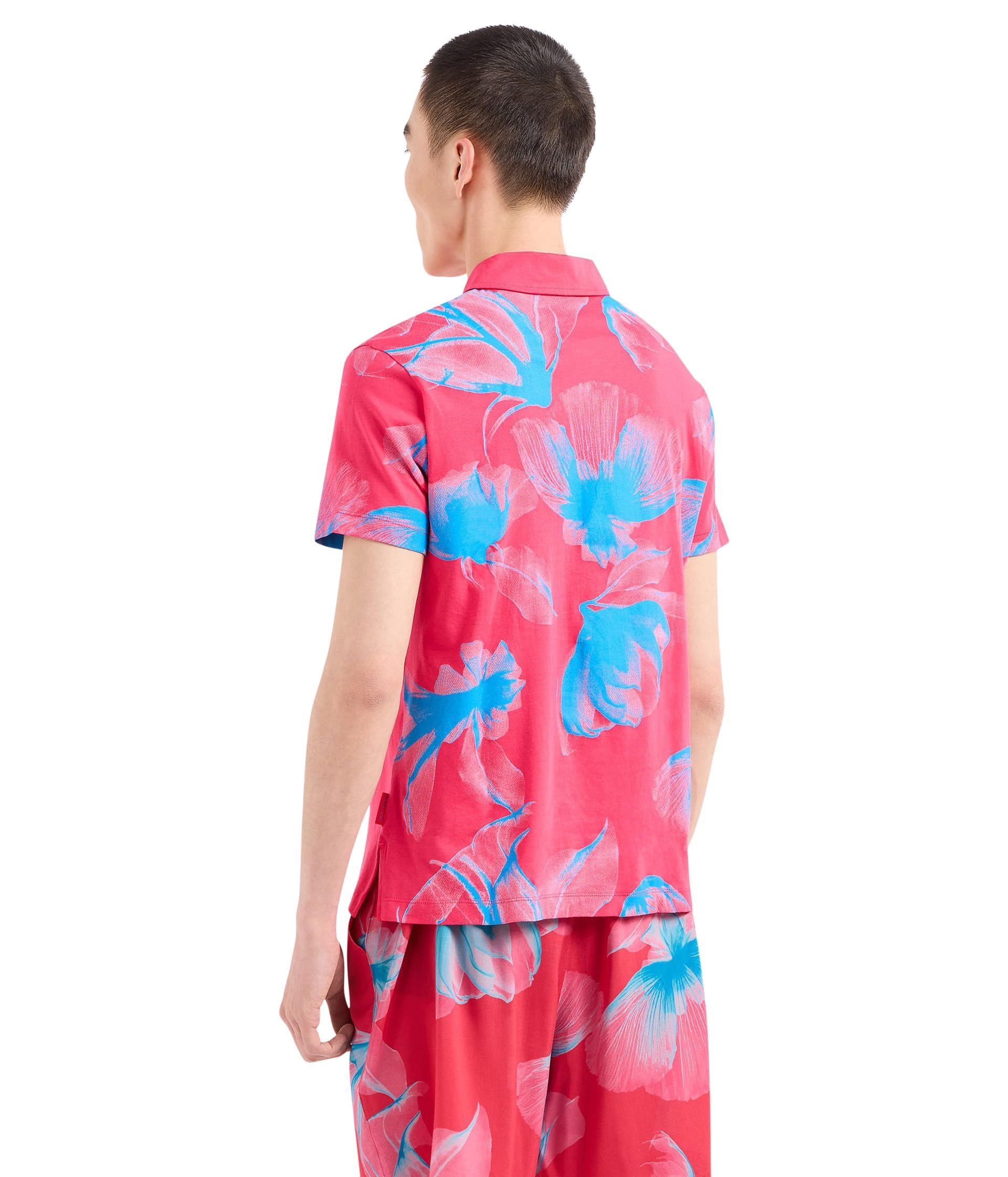 Модель з класичним коміром-поло та планкою на ґудзиках, короткими рукавами та подолом з акуратними бічними розрізами для зручної посадки. Оригінальний квітковий принт на спині та рукавах додає образу виразності, а логотип бренду на грудях підкреслює фірмовий стиль.
