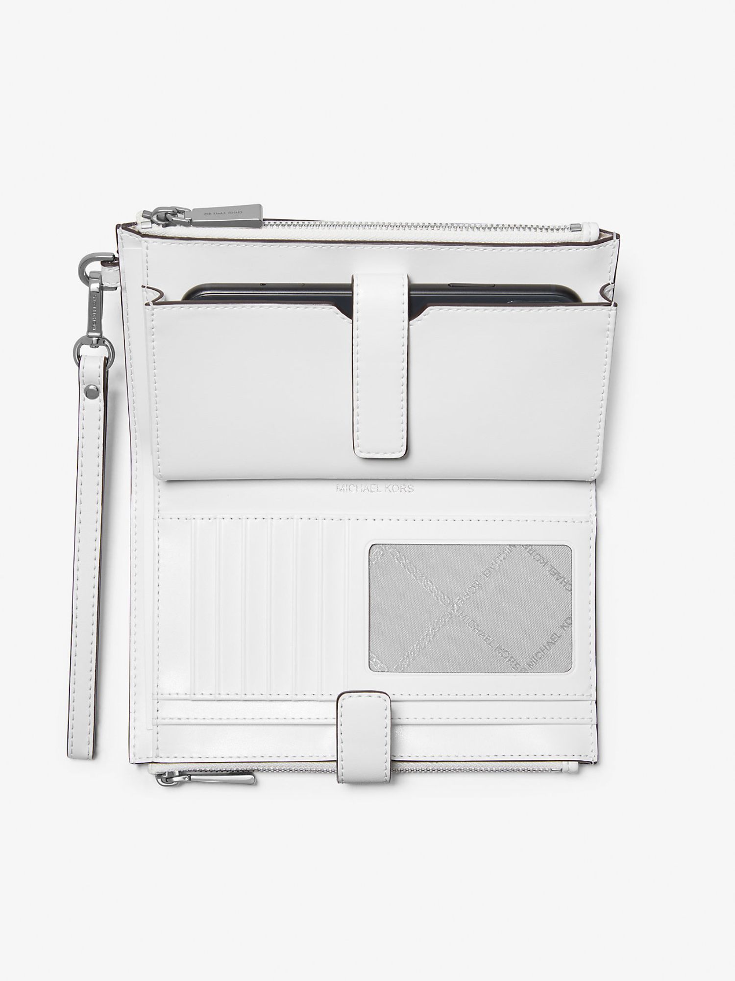 Має дві сторони на блискавці, що розкриваються, відкриваючи центр із кишенями для всього необхідного – від кредитних карток до смартфона. Знімний ремінець на зап'ястя робить його досить універсальним, щоб носити окремо або покласти в сумку.