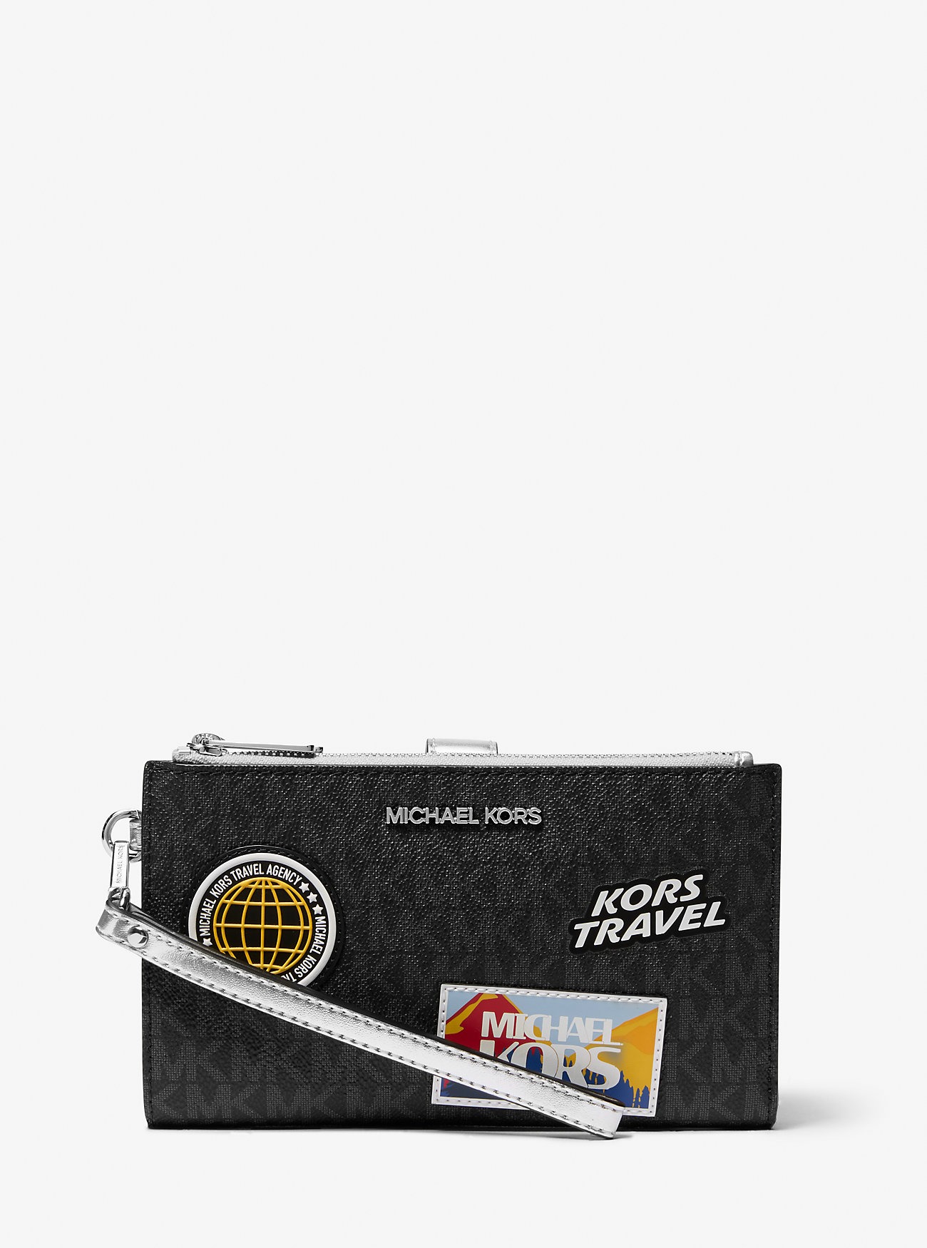 Виконаний із міцного матеріалу з фірмовим принтом монограми, він стане практичним та стильним аксесуаром на кожен день. Гаманець оснащений двома відділеннями на блискавці і центральною частиною, що застібається на кнопку, де передбачено сім слотів для карт, три відділення для купюр і зручну кишеню на кнопці, в яку легко поміщається смартфон. Знімний ремінець на зап'ясті робить гаманець універсальним: його можна носити як самостійний аксесуар або покласти у сумку.