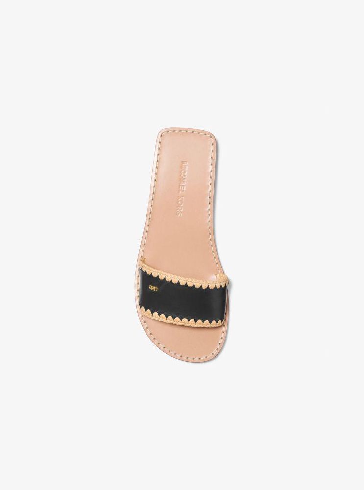 Шльопанці Drea c фактурною текстурою, яка поєднується з натуральною шкірою та обробкою із соломи, виконаною прошивкою.
