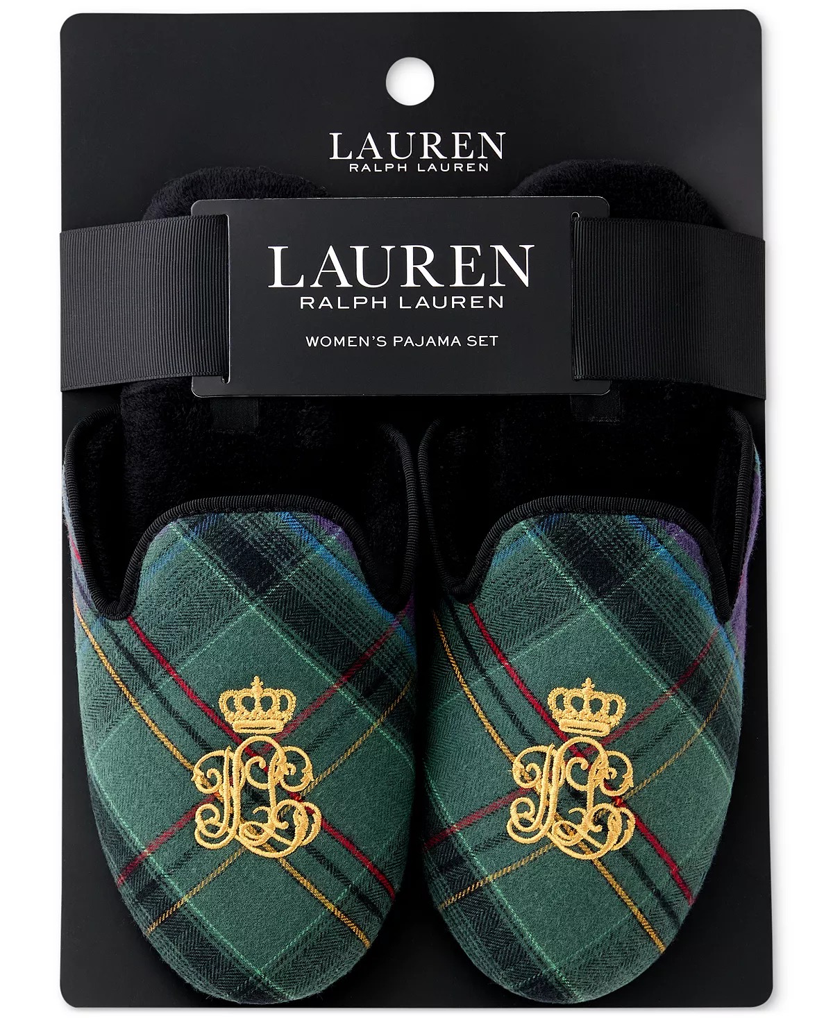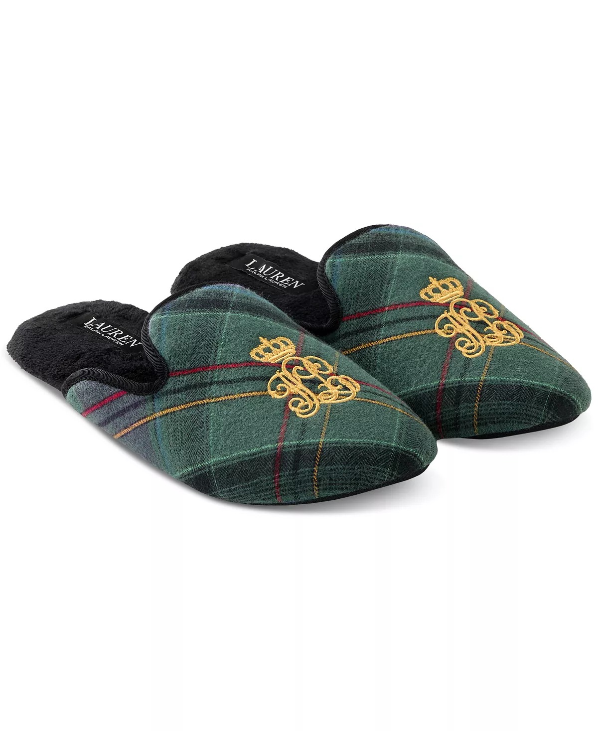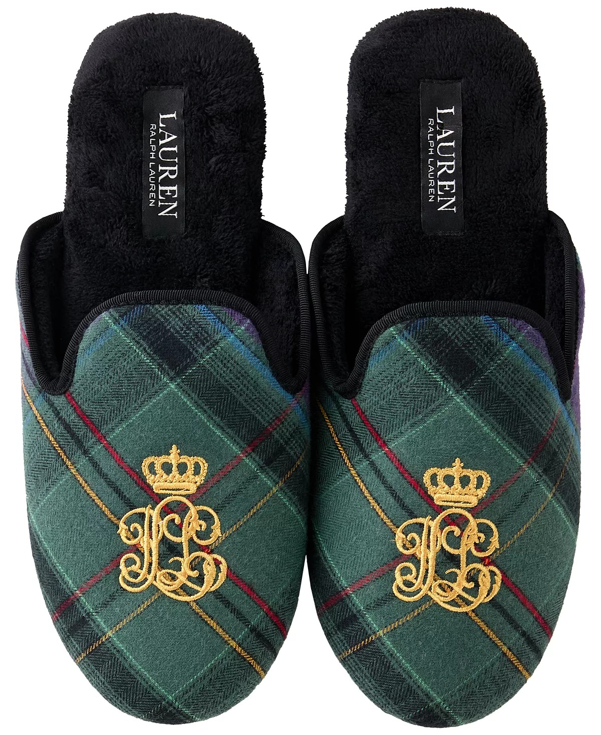 Класичні домашні капці з принтом у клітку та вишитим логотипом-монограмою бренду зверху.