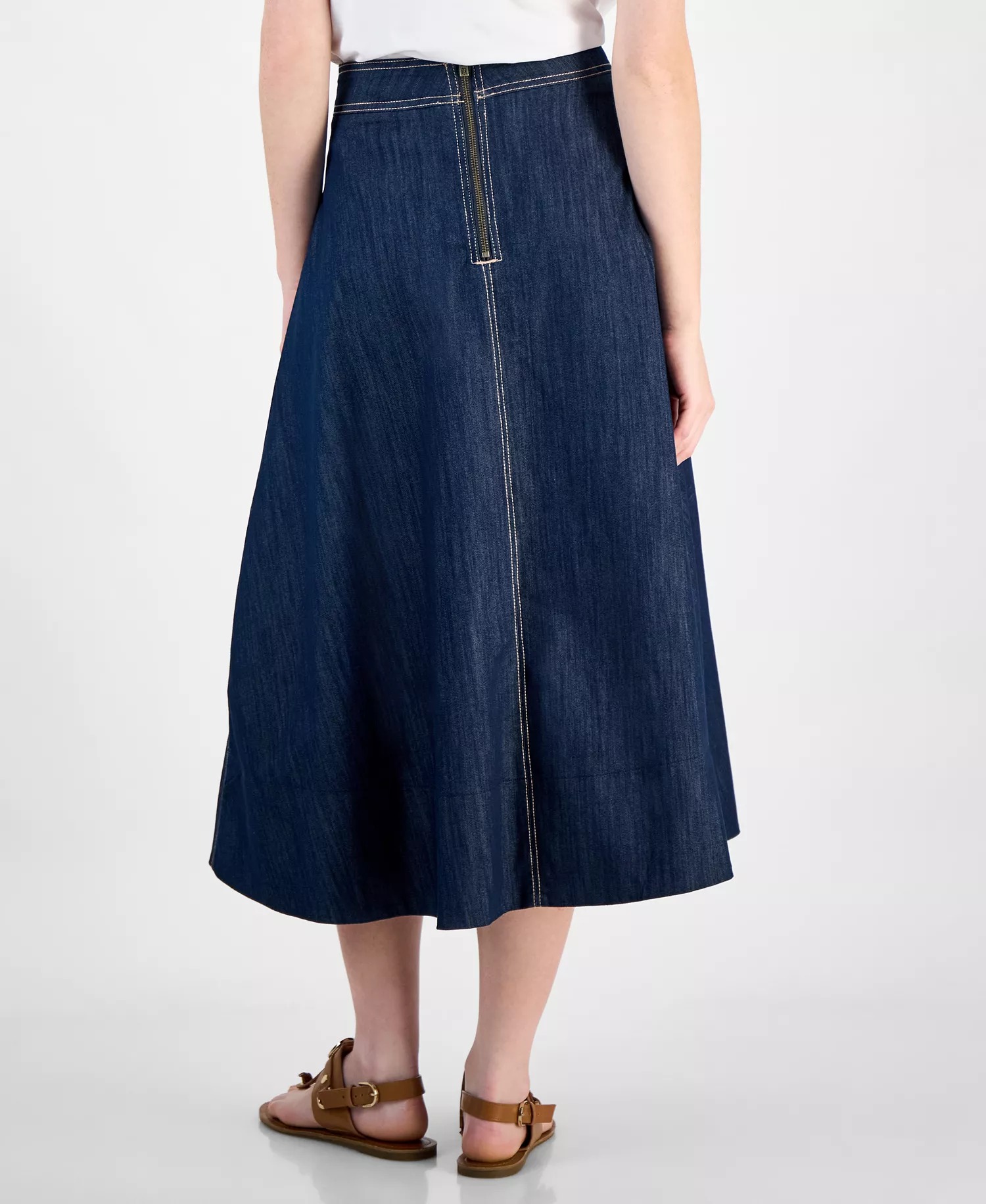 Сзади застегивается на молнию и скрытую пуговицу.