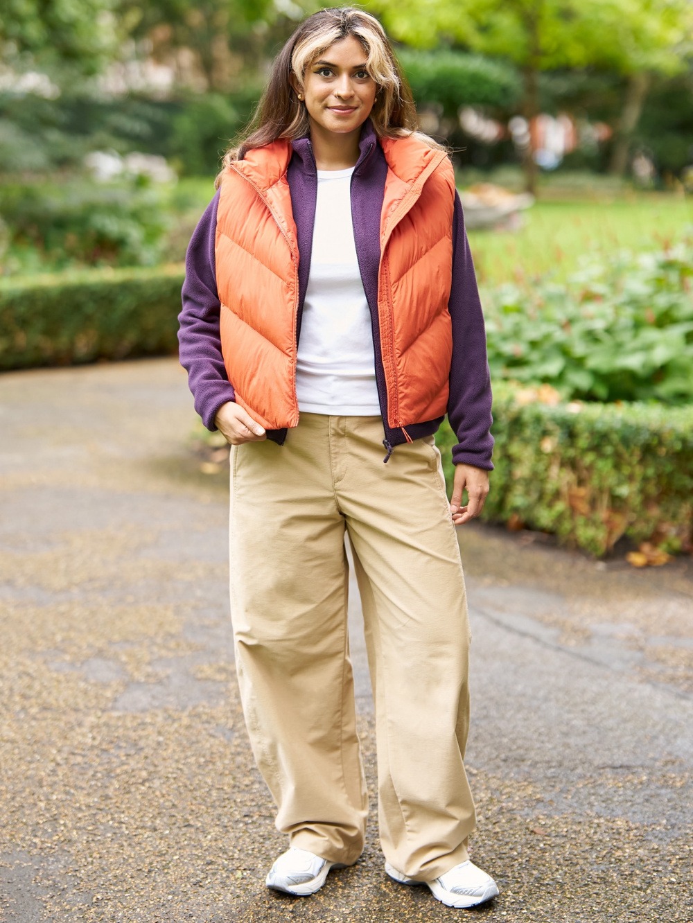 Жилет на блискавці виконаний у стьобаному дизайні та доповнений коміром-стійкою, що захищає від вітру. Вільний крій в області проймів забезпечує комфорт і свободу рухів. З боків розташовані дві кишені на блискавці, а поділ оснащений утяжками для регулювання посадки.