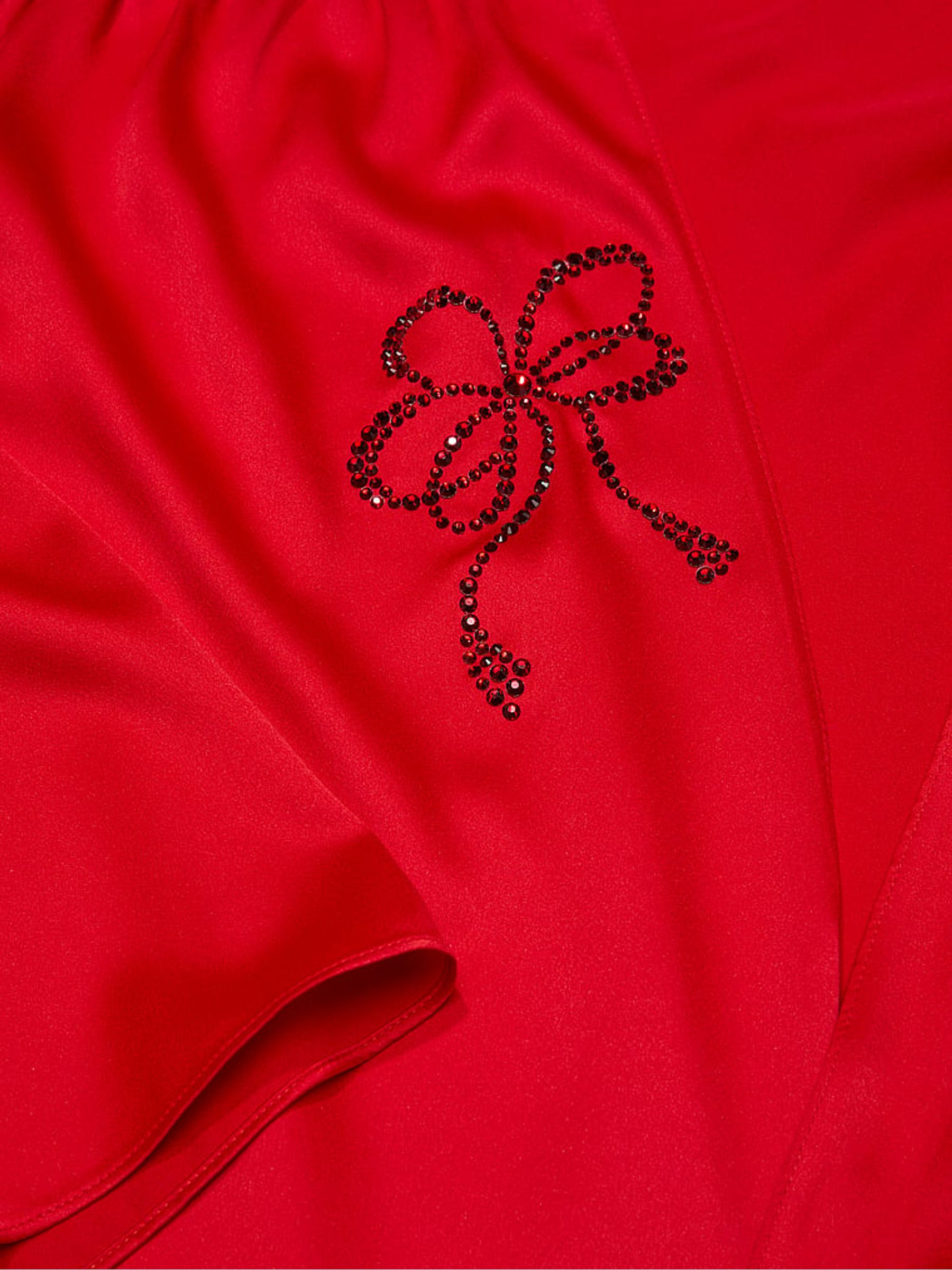 Отделка стразами в виде банта на груди.
